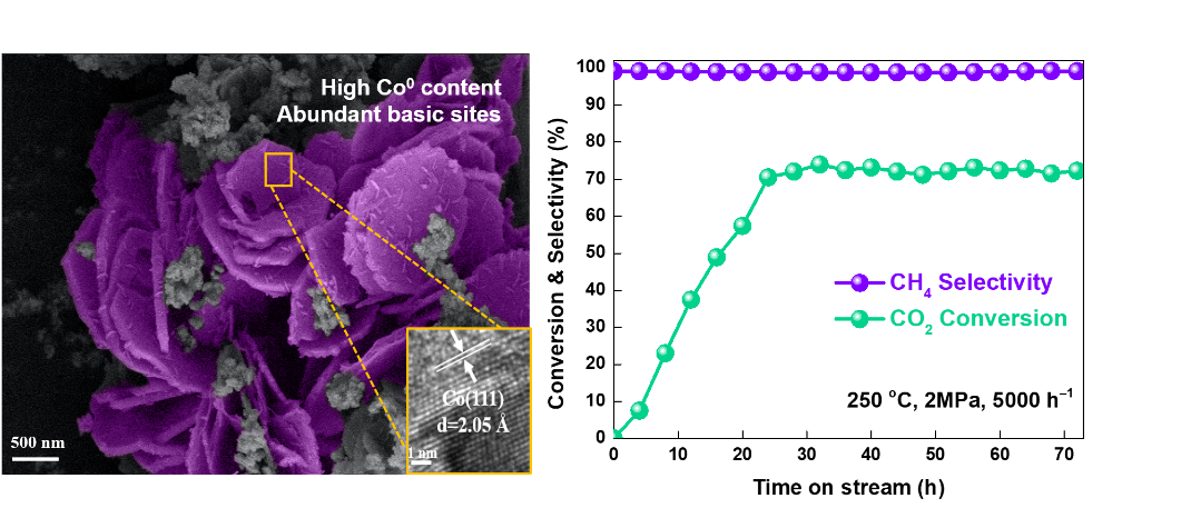随着各国对碳减排技术的逐渐重视以及我国双碳目标的提出,CO2耦合来自可再生能源的“绿氢”转化制化学品成为目前CO2资源化利用的研究热点。其中,CO2甲烷化可将可再生能源转存到理想能量载体甲烷中,是煤炭清洁利用、“电转气”技术的重要组成部分。然而,该反应存在热力学、动力学不匹配的问题,热力学低温有利,但低温下反应受动力学限制CO2难以高效转化利用。因此,开发低温下兼备高反应活性、高稳定性的催化剂非常具有挑战。