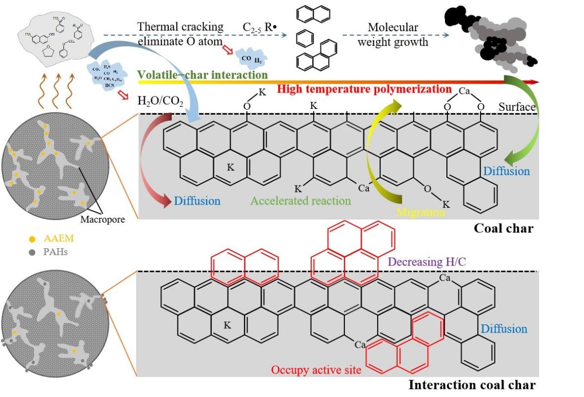 该项成果基于两段式固定床反应器从含氧复合物角度解耦研究了挥发分-半焦交互作用行为。交互行为本质是含氧化合物脱氧、脱氢和开环再聚合过程,并会抑制脱酸和脱酮反应。交互作用过程聚合产生的多环芳烃(PAHs)占据半焦活性位点是造成其失活主要原因,C–O结构是煤焦活性位点最直观的表达形式。酚羟基、羧基、醛基和醚基基团在交互作用过程表现出依次降低的活性抑制行为。有针对性地调控液相产物向醛类和醚类化合物分布,有利于降低交互作用强度,提高气化炉的可靠性和能源效率,拓展了气化炉设计和优化思路。