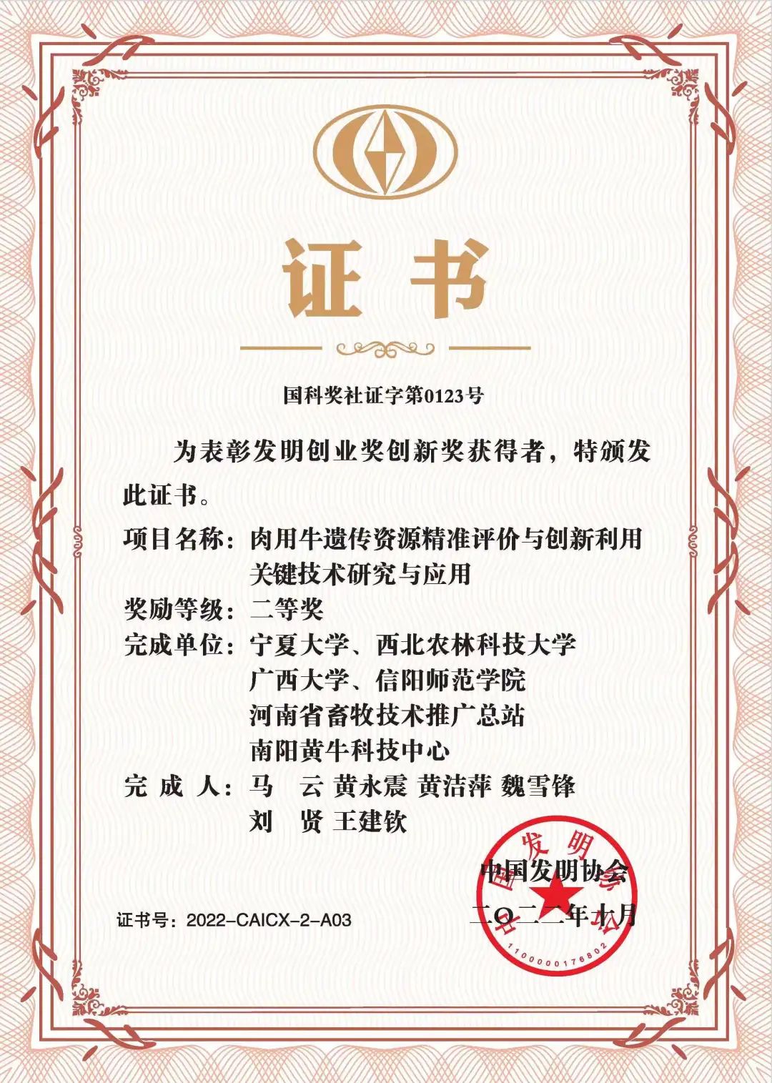 【永利集团304官网新闻中心讯 农学院】近日,中国发明协会公布了2022年发明创业奖创新奖获奖情况,从受理申请的约5000项成果中,最终评选出了一二等奖近300项,我院马云教授联合西北农林科技大学、广西大学等6个单位合作申报的“肉用牛遗传资源精准评价与创新利用关键技术研究与应用”成果获中国发明创业奖创新奖二等奖。永利集团304官网为第一获奖单位。