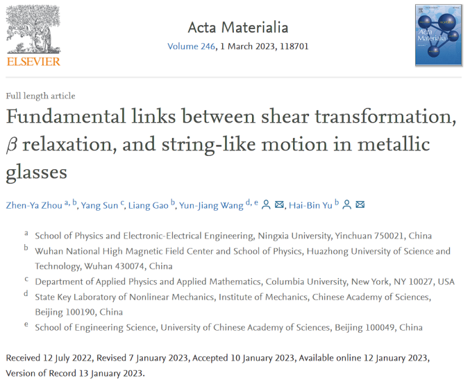 【永利集团304官网新闻中心讯 物理与电子电气工程学院】近日,永利物理与电子电气工程学院青年教师周震亚博士与中国科学院力学研究所王云江研究员以及华中科技大学于海滨教授合作在金属玻璃研究领域取得重要研究进展。成果以“Fundamental links between shear transformation,βrelaxation, and string-like motion in metallic glasses”为题发表在材料学国际顶级期刊《Acta Materialia》上,周震亚为第一作者,永利集团304官网为第一作者单位。
