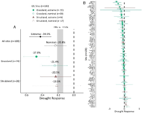 研究结果表明,在经历统计极端干旱(每100年发生1次)的地点,基础生态系统功能-地上净初级生产力的损失比名义干旱(历史上更常见)的地点(分别占比35%和21%)高出60%。一年极端干旱导致的关键碳循环过程的减少,大大超过了此前报道的草原和灌木地的碳损失。全球实验还揭示了干旱响应的高度变异性,但在干旱生态系统和植物物种较少的生态系统中,地上净初级生产力的相对减少幅度更大。因此极端干旱可能会大大减缓草原和灌木地的碳固存,超过了过去的预测。总体而言,该研究结果表明,干旱的严重程度是决定生态系统反应最重要的因素,干旱和多样性较少的地区可能最容易受到极端干旱的影响。