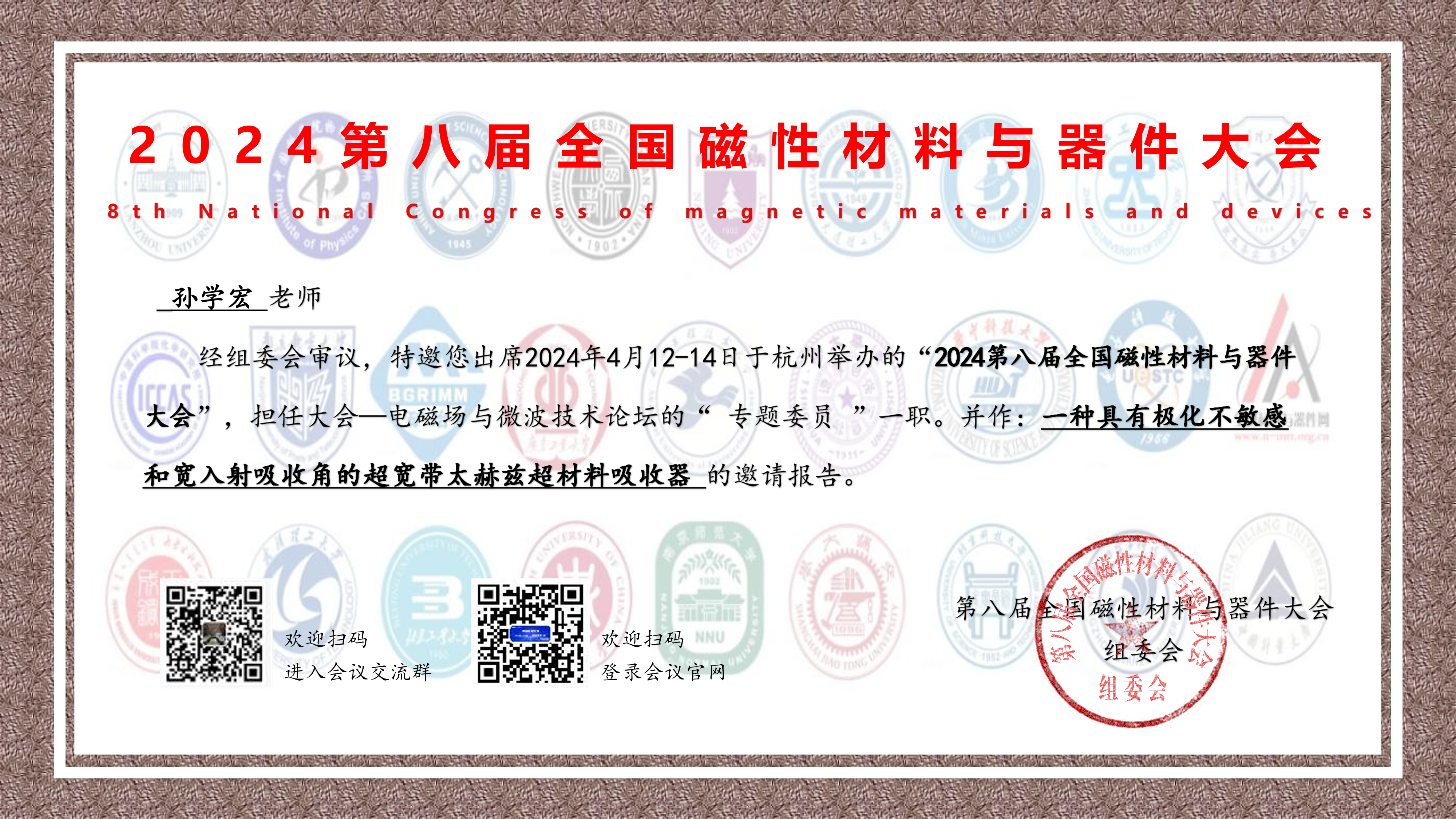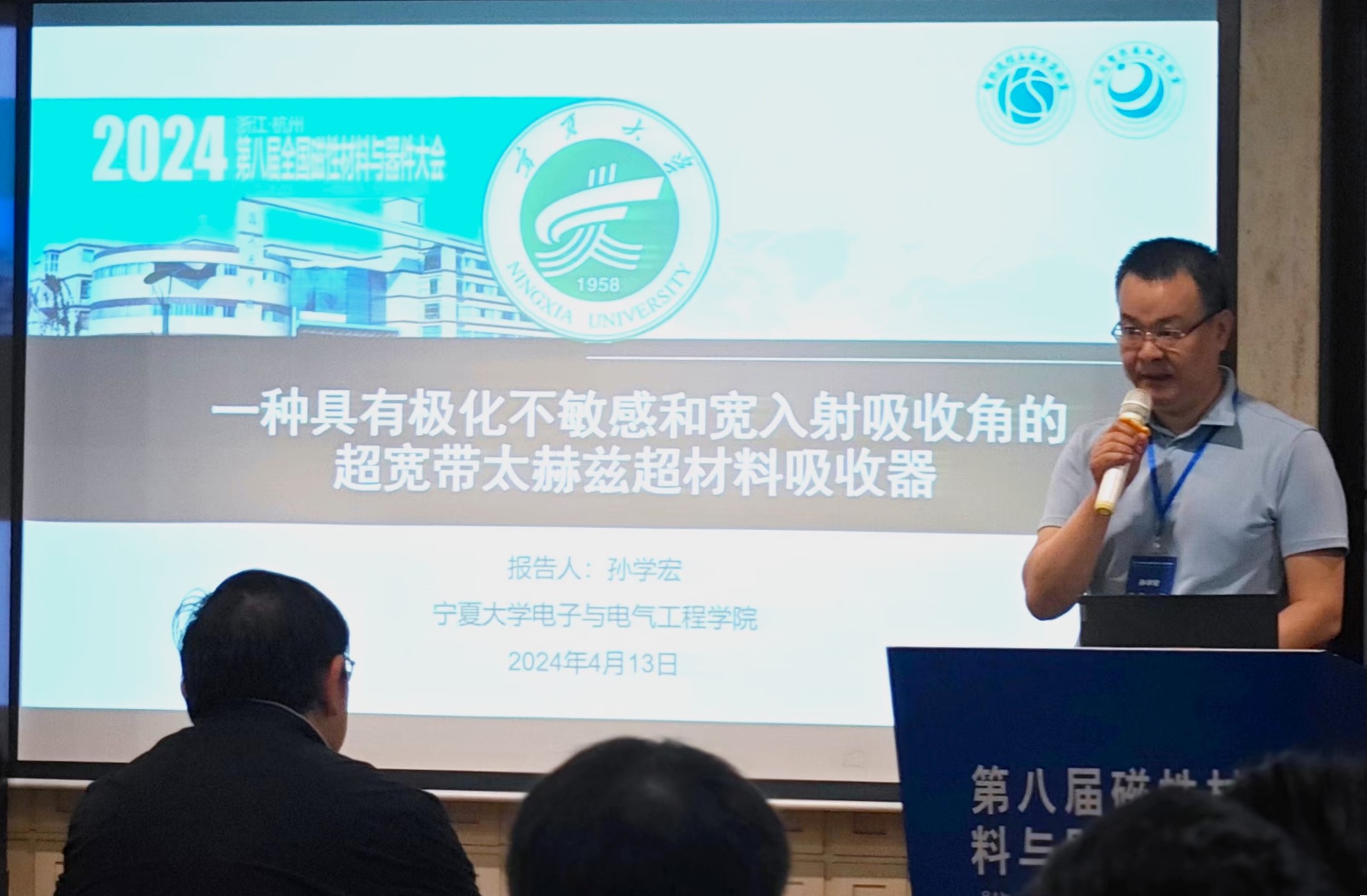 【永利集团304官网新闻中心讯 电子与电气工程学院】4月12日至14日,第八届全国磁性材料与器件大会在杭州顺利召开,全国各大院校及企业代表近600人参加了此次大会。大会邀请了都有为、朱静等五位知名院士和国内外磁性材料与器件应用领域的学者、科研人员、企业家发表课题演讲与成果分享,为当下磁性材料产业发展建言献策。永利电子与电气工程学院院长孙学宏教授受邀在大会分论坛做“一种具有极化不敏感和宽入射吸收角的超宽带太赫兹超材料吸收器”学术报告。