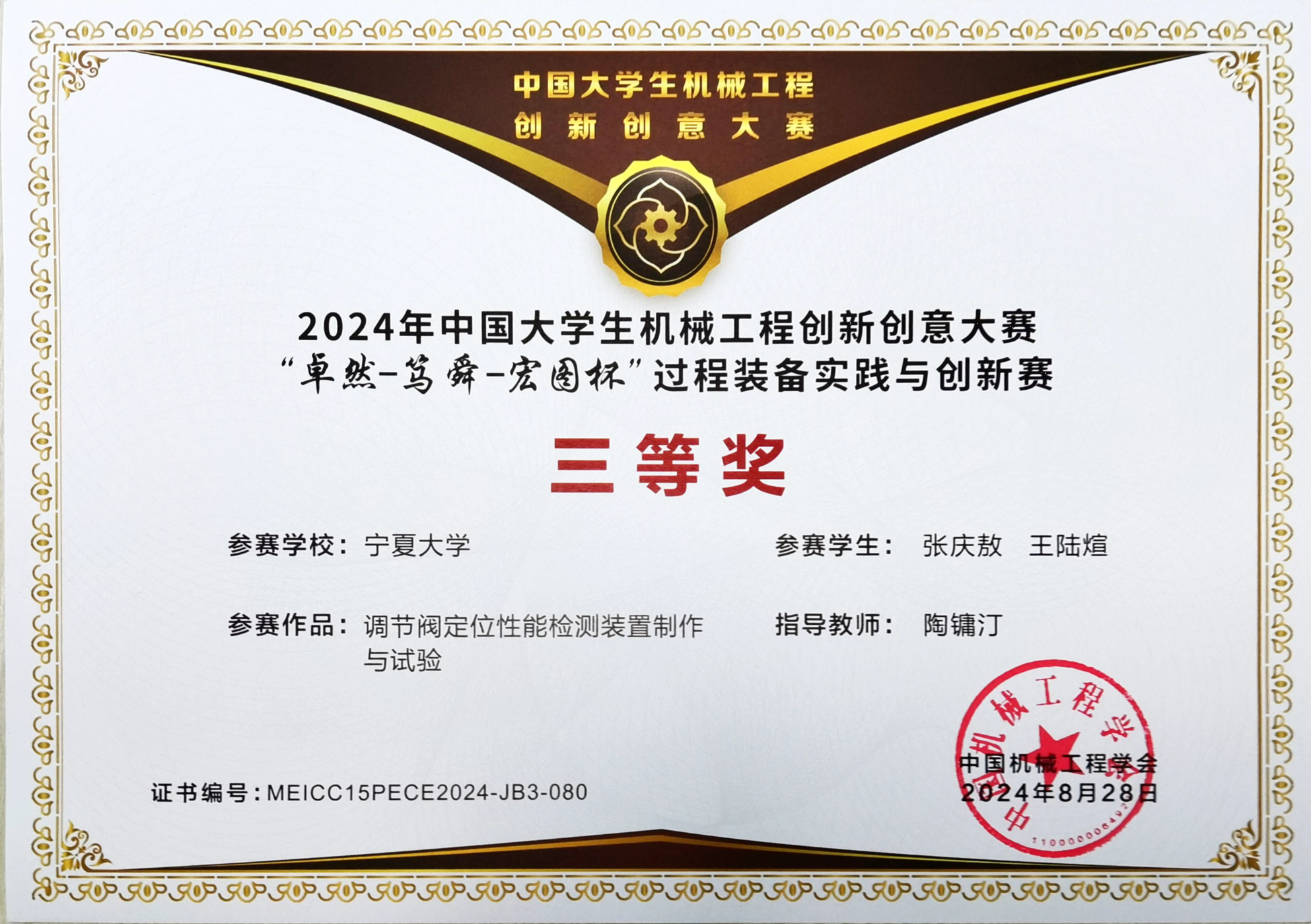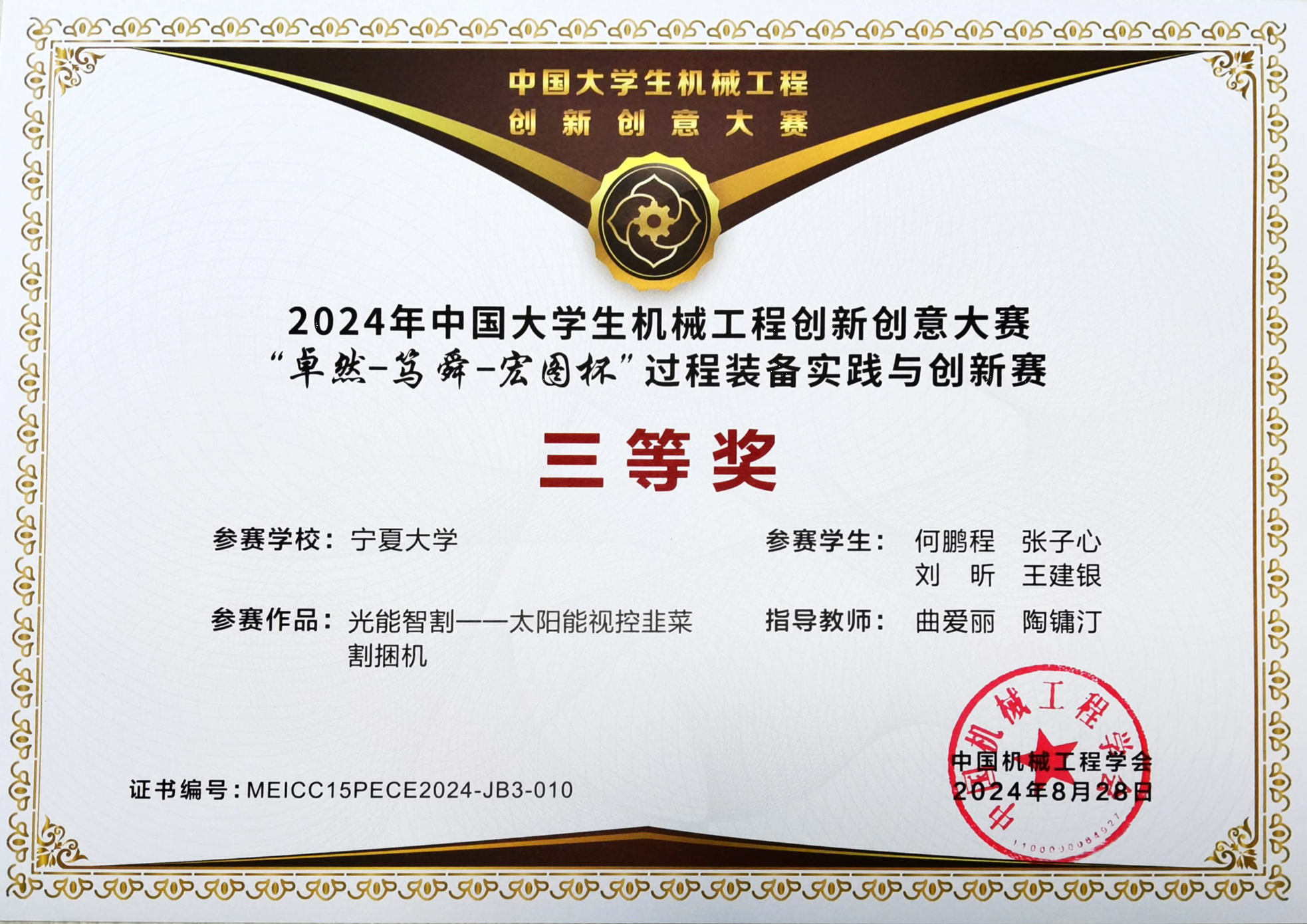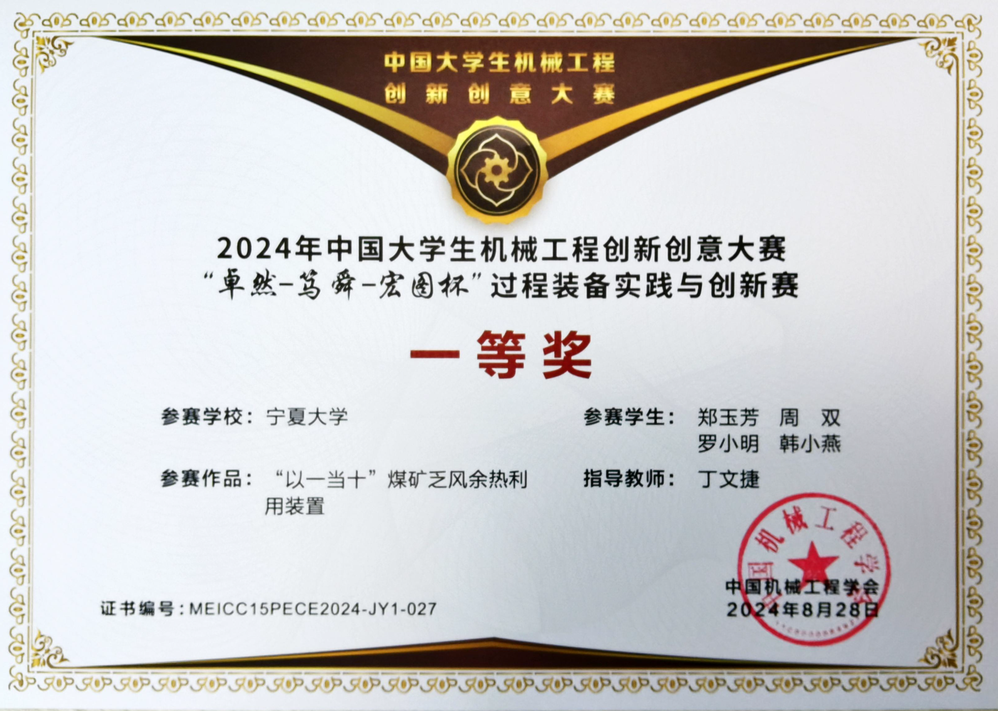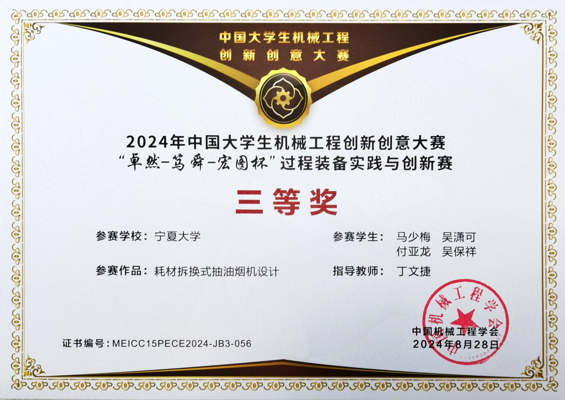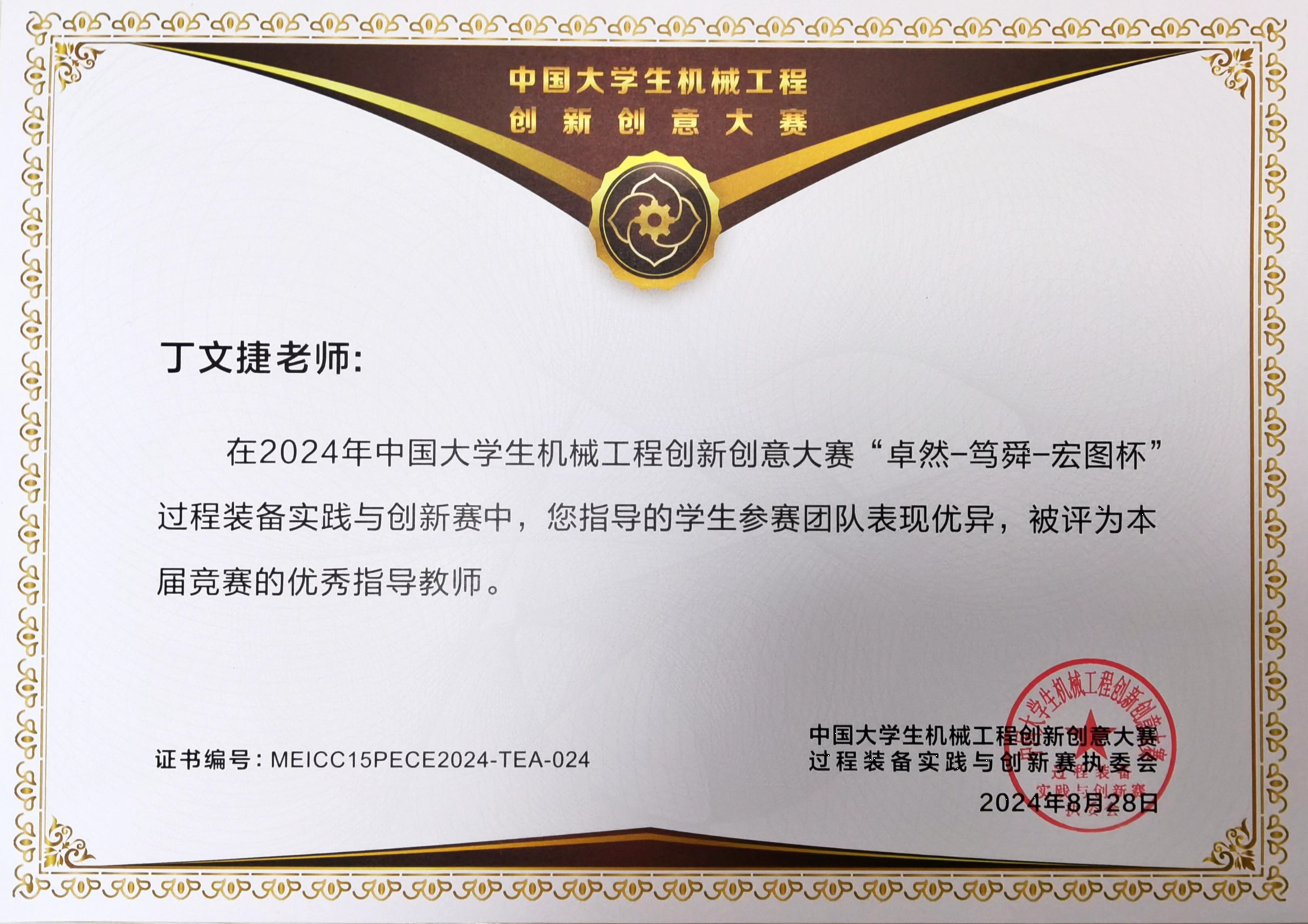 【永利集团304官网新闻中心讯 机械工程学院】近日,由中国机械工程学会主办的2024年中国大学生机械工程创新创意大赛—“巨化-卓然-宏图杯”过程装备实践与创新赛评选结果揭晓,永利机械工程学院丁文捷老师获本届竞赛优秀指导教师,研究生组丁文捷教师团队《“以一当十”煤矿乏风余热利用装置》获得国赛一等奖,本科生组丁文捷教师团队《耗材拆换式抽油烟机设计》,陶镛汀教师团队《调节阀定位性能检测装置的制作与试验》,曲爱丽、陶雍汀《光能智割—视控韭菜割捆领航者》获得三等奖。