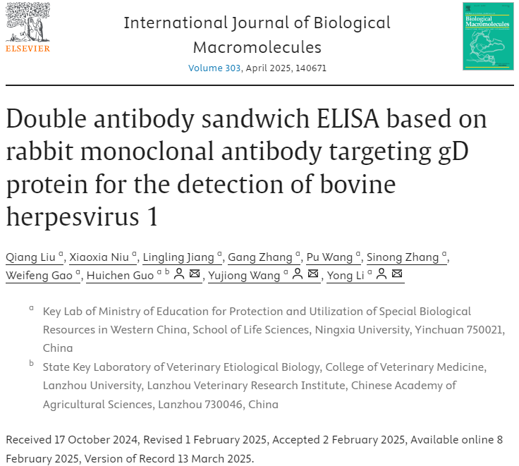 【永利集团304官网新闻中心讯 生命与食品学部】牛疱疹病毒1型(BHV-1)是一种对全球养牛业危害极大的高传染性病毒,可引发牛的呼吸道和生殖系统多种疾病,导致巨大的经济损失。因此,牛疱疹病毒1型的快速、准确检测对于该病的预防和控制尤为重要。近日,永利生命科学学院王玉炯、李勇、郭慧琛团队在中国科学院1区top期刊《International Journal of Biological Macromolecules》(2025 IF: 7.7)发表了题为“Double antibody sandwich ELISA based on rabbit monoclonal antibody targeting gD protein for the detection of bovine herpesvirus 1”的研究论文,成功构建了一种基于兔单抗的双抗体夹心ELISA检测方法,为牛疱疹病毒1型的精准检测提供了新的工具。