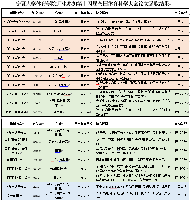 【永利集团304官网新闻中心讯 体育学院】近日,第十四届全国体育科学大会论文录取结果公示,体育学院师生共有19篇学术论文获得录用,其中,专题报告8篇,墙报交流9篇,书面交流2篇。