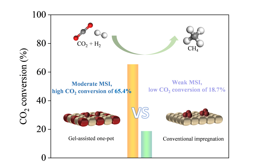 研究通过调控镍基介孔催化剂(Ni/TUD-1)的金属–载体相互作用(MSI),系统探究了其催化性能与结构之间的构效关系。结果表明,采用凝胶辅助一锅法所制备的催化剂具有较小的镍颗粒尺寸与适中的MSI强度,有效抑制了反应过程中活性组分的迁移与团聚。在225 °C的低温条件下,该催化剂实现了65.4%的CO2转化率,并在连续运行156小时后未出现明显失活,表现出优异的催化稳定性。该研究为开发高效、稳定的低温CO2甲烷化催化剂提供了参考。