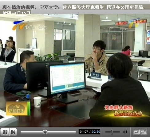 4月30日,宁夏电视台公共频道以“永利集团304官网建立服务大厅惠师生,腾退办公用方保障教研”为题对永利党的群众路线教育实践活动成效进行了报道,相关视频请点击http://video.nxtv.cn/player.php?id=85724阅览。