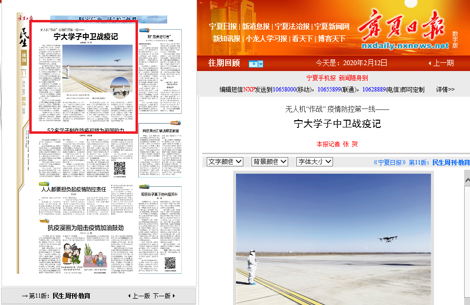 近日,永利学生创业团队把无人机技术应用到抗击疫情中,宁夏日报(0212)第11版头条、中国新闻网客户端和宁夏日报客户端对此进行报道。