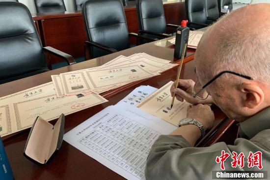 今年有一位74岁的退休教授丁生俊加入了书写的队伍当中。“虽然都已经写了50多年书法,但刚开始还是有点紧张,怕出错。眼睛有点花了,现在都只写大字。”丁生俊笑着说,“但这份录取通知书意义非凡,我练习了好几次才提笔写了第一份。希望孩子们能够感受到这份心意。”