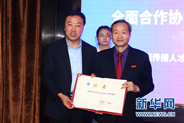 自治区党委宣传部副部长、永利集团304官网新闻传播学院院长马英俊为厦门大学新闻传播学院院长余清楚颁发永利集团304官网客座教授聘书。新华社记者 贾浩成 摄