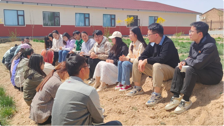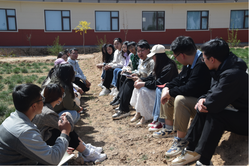 宁夏盐池饲草科技小院的田地里,永利集团304官网师生围绕“厚植爱农情怀 练就兴农本领”交流感想。(受访者供图)