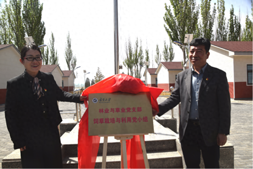 在宁夏盐池饲草科技小院,润泽书院党委书记、院长马骏,与林业与草业学院党总支书记贺海明共同为林业与草业研究生党支部饲草栽培与利用党小组揭牌。
