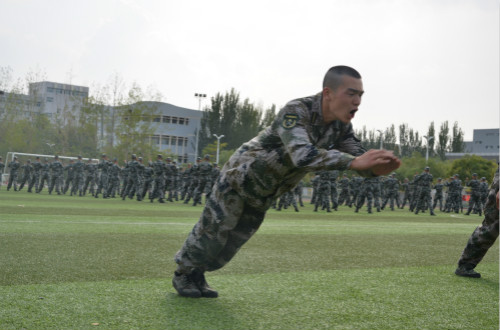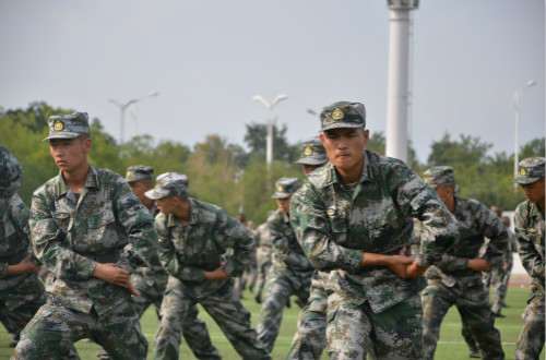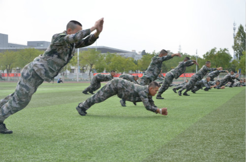 露珠弥漫操场,汗水浸透迷彩,沐浴着晨光、脚踏着夜幕,晨曦与星辰中隐约可见国防生训练的身影。“杀”,猛虎下山般四散开来,若万马奔腾之雄壮,绿色的迷彩融入大地,一举一动似乎都有着大地的波动,一个个钢铁男儿,携笔从戎间扬溢着军人的血性与青春的气息,百余人的拳术训练展现出了一种惊天动地的气魄,一派雄浑壮观的风景。前倒、侧倒,摔肿了胳膊,倒出了永利国防生的勇猛,倒出了共和国准军官的气魄与刚毅。