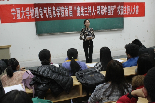 11月16日晚七点,物理电气信息学院首届“挑战主持人,精彩中国梦”校园主持人大赛在105教室拉开帷幕,在物电学院院领导的支持下,院团委、学生会的组织下和同学们的热情参与下,本次活动获得圆满成功。此次主持人大赛有53人参赛,其内容包括一分钟自我介绍及稿件的朗读。同学们热情高涨,积极准备,向同学们和评委展示了他们得风采。同学们的自我介绍各不相同,稿件的朗诵效果也是各具特色,给人留下难忘的精彩。学院首届校园主持人大赛在同学之间得到了一致的好评,同时此次大赛给学院同学提供了一个展示自我的良好平台,提高了自身的心理素质,给参赛者以自我认识、突破自我、超越自我的机会。