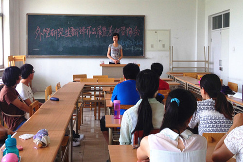 外国语学院研究生教学部副主任贾文娟主持了此次活动,向与会人员介绍了近年来学院硕士学位点的建设情况及招生情况,展示了学院师生近年来的笔译成果,提出了学院学术型硕士学位点及翻译硕士学位点的建设计划和主要内容,介绍了学院研究生部提升教学质量、促进学生翻译能力提升的工作计划与安排。2013级研究生代表结合自身的考研经历就志愿填报、资料选取、复习方法、面试技巧等向前来咨询考研的人员传授各自的经验。之后,有意向报考的人员与学院研究生就考研、英语学习、翻译能力提高等问题展开了活跃的交流与讨论。期间,大家分组交流考研心得体会,认真阅读参展译作,并不时发表着对参展译作的评价。
