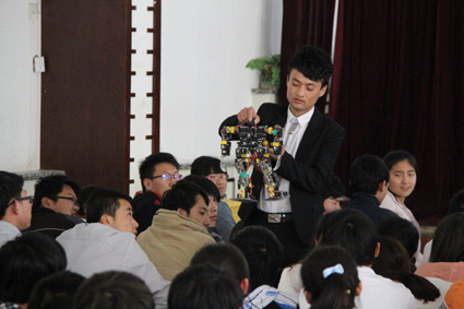 宣讲会现场,主持人对宣讲团成员进行了简要介绍。随后,宣讲团成员分别上台介绍自己的科技创新作品,畅谈奋斗历程。谢海波介绍了他的专利《玉米旋耕覆膜播种一体机》的制作原理,并结合自身成长经历讲述了发明的灵感来源、研发历程和心灵感悟。李云航、马小科现场展示了他们的发明——智能家居中控系统、舞蹈机器人。通过实际操作让广大师生对科技创新作品有了更加直观的了解。宣讲团成员展示的发明设计新颖、实用性强,吸引了在座师生的眼球,赢得了现场观众的阵阵掌声。