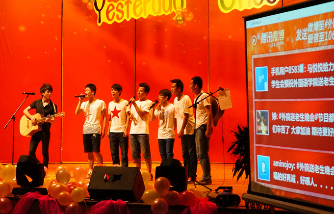 舞蹈《床前明月光》拉开了晚会的帷幕。主持人用不同的语言开场,突出了外国语学院的特色。院长周玉忠致辞,表达了学院对2009级毕业生的殷切希望和深深祝福。晚会节目形式各异,精彩纷呈。吉他弹唱《我的好兄弟》触动了大家心底的那份弥足珍贵的兄弟情,充满活力与个性的日本动漫Cosplay 使晚会的气氛更加活跃,一段感人的毕业生微电影让同学们更加不舍和珍惜美丽的大学校园生活,观众们在晚会上还积极参与到微博上墙的活动中,使晚会亲切而又温馨。