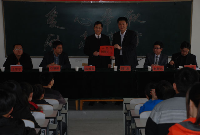 降龙院长在捐赠仪式上作了讲话,他首先代表学院全体师生对宁夏亿美生物科技有限公司的爱心捐助表示感谢。他说,捐资助学是中华民族乐善好施、兴学助教的优良传统,亿美公司的捐助义举充分体现了公司强烈的社会责任感和对社会的回馈。他希望受助同学珍惜这宝贵的资助,努力学习、自立自强,用优异的成绩回报社会。最后,降龙院长代表学院接受了宁夏亿美公司为高职学院家庭经济困难学生捐赠的一万元人民币。