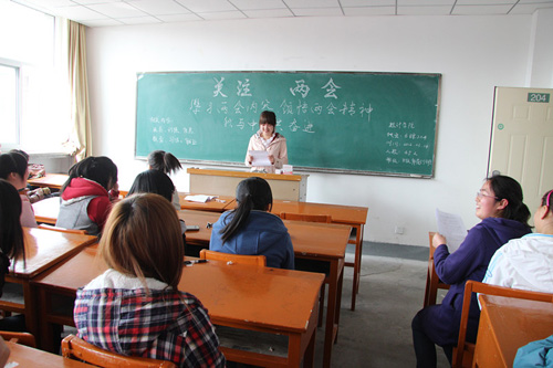 在主题班会上,各班同学们围绕着两会热点各抒己见,有的同学对“涨工资”议题颇感兴趣,因为今年政府工作报告中关于“完善工资制度,建立工资正常增长机制”的“涨工资”内容,与不久前人力资源和社会保障部提出的“‘十二五’期间职工工资翻番”规划,给广大将要走出校门谋取工作的大学生们和自己的亲属们带来实实在在的福音;不少男同学对现在房价过高表示不满与担忧并存,于是对“房价合理回归”议题十分关注。政府工作报告指出,要严格执行并逐步完善抑制投机、投资性需求的政策措施,促进房价合理回归。不仅如此,全国人大代表孙甚林表示今后国家房产调控政策应逐渐转向以税收、金融、法律等为主的综合调节方式,通过征收房地产税增加保障房供应量等方式,促使房价回归到正常水平;有的同学认为 “异地高考”将解决很多流动人口子女在上学问题上的一大担忧,是解决城乡二元问题、保障进城务工人员民生的重要一步。