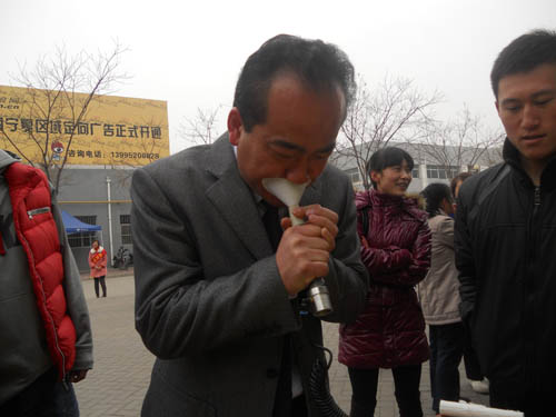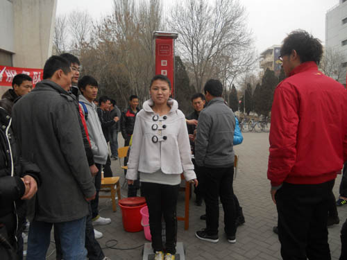 虽然天气比较寒冷,还飘着小小的雪花,但是却丝毫不减体育学院志愿者的认真热情。从活动开始,就吸引了很多同学前来咨询、测试。体育学院学生会的礼仪热情的向过往的同学和行人介绍此次活动的内容;负责测试的同学认真的为前来参加测试的同学们进行身高、体重、血压、肺活量等项目的测试;而运动健康咨询处的同学则耐心的为前来咨询的同学进行讲解。校团委冯奎书记也被热情的学生志愿者邀请来参加测试。学校食堂的工作人员和一些路人也被我们的活动所吸引,都排队加入我们的活动中。