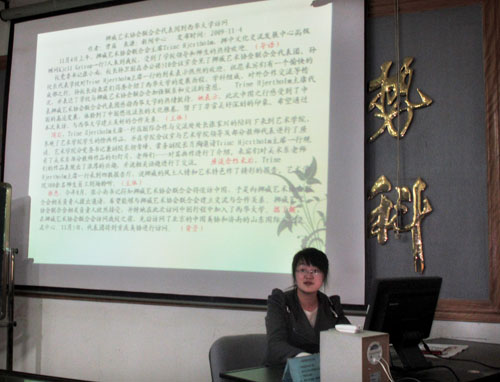 韩娅琦首先谈了在“特区建设30年,大学生记者看深圳”期间的体会。然后,结合自身的实践经验,针对“怎么去发现新闻?消息和通讯的区别是什么?”等问题为大家做了详细的讲解。她结合课件用实例点明通讯,要注意立意的时代性。同时,要注意选材的典型性、结构的安排以及手法特色。她还阐明了在采访过程中,七分材料准备的必不可少以及谈话所包含的艺术性。