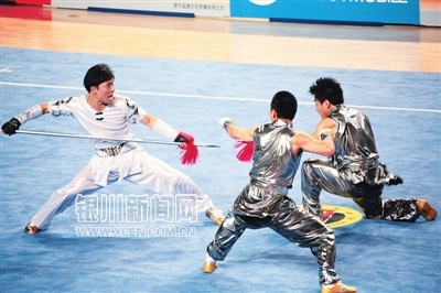 【永利集团304官网新闻中心讯 体育学院】10月14日,永利体育学院2006级学生马进文、黄宝光与同学左长辉合作,在第十一届全国运动会武术男子对练项目上为宁夏代表团夺得一枚银牌。