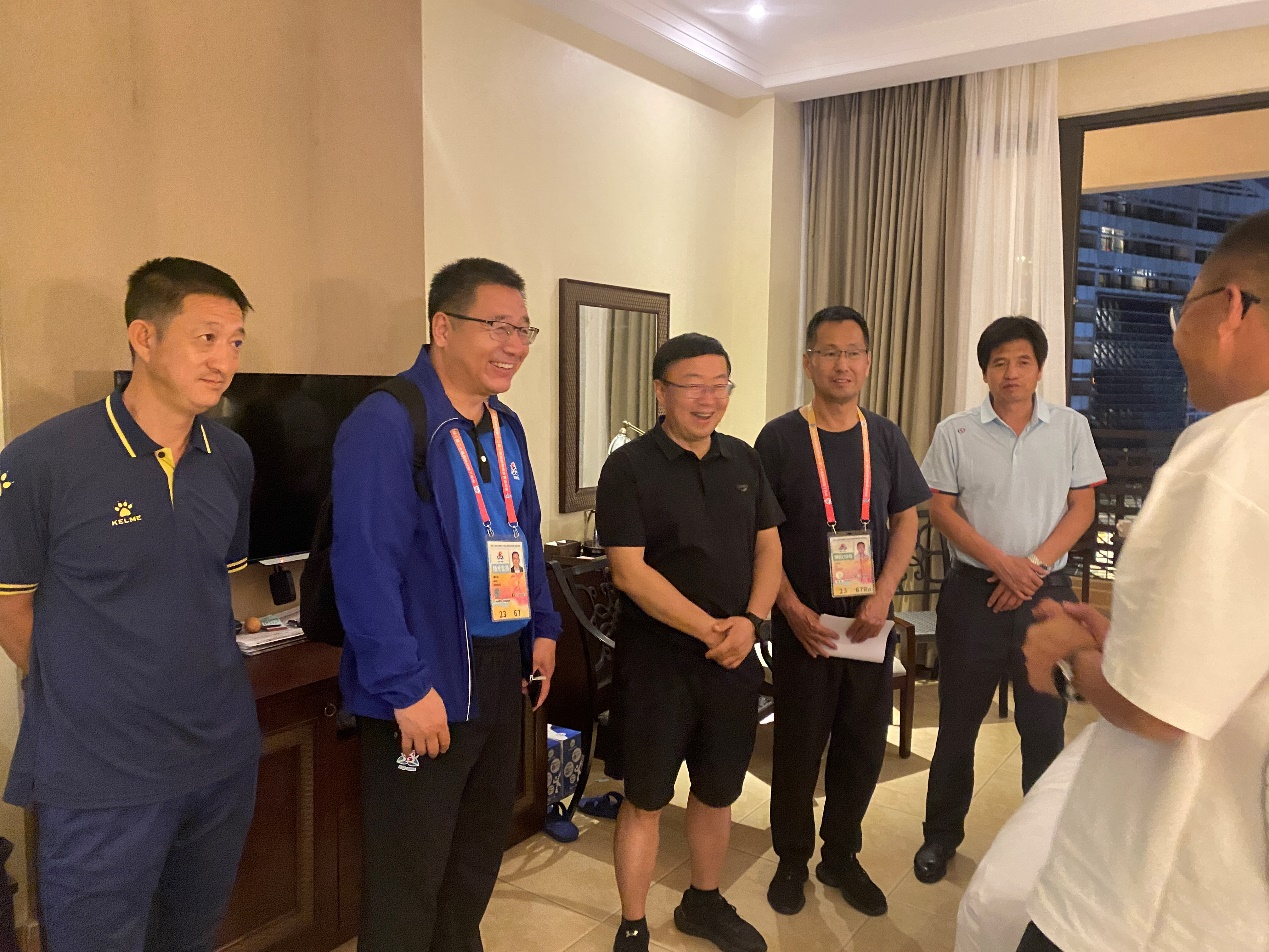 【永利集团304官网新闻中心讯 体育学院】11月25日晚,校党委常委、副校长黄河、体育学院党总支书记王志霄、体育学院院长咸云龙在海南省宁夏代表团驻地马兰花酒店慰问了永利木球队、花炮队、高脚竞速队的运动员。
