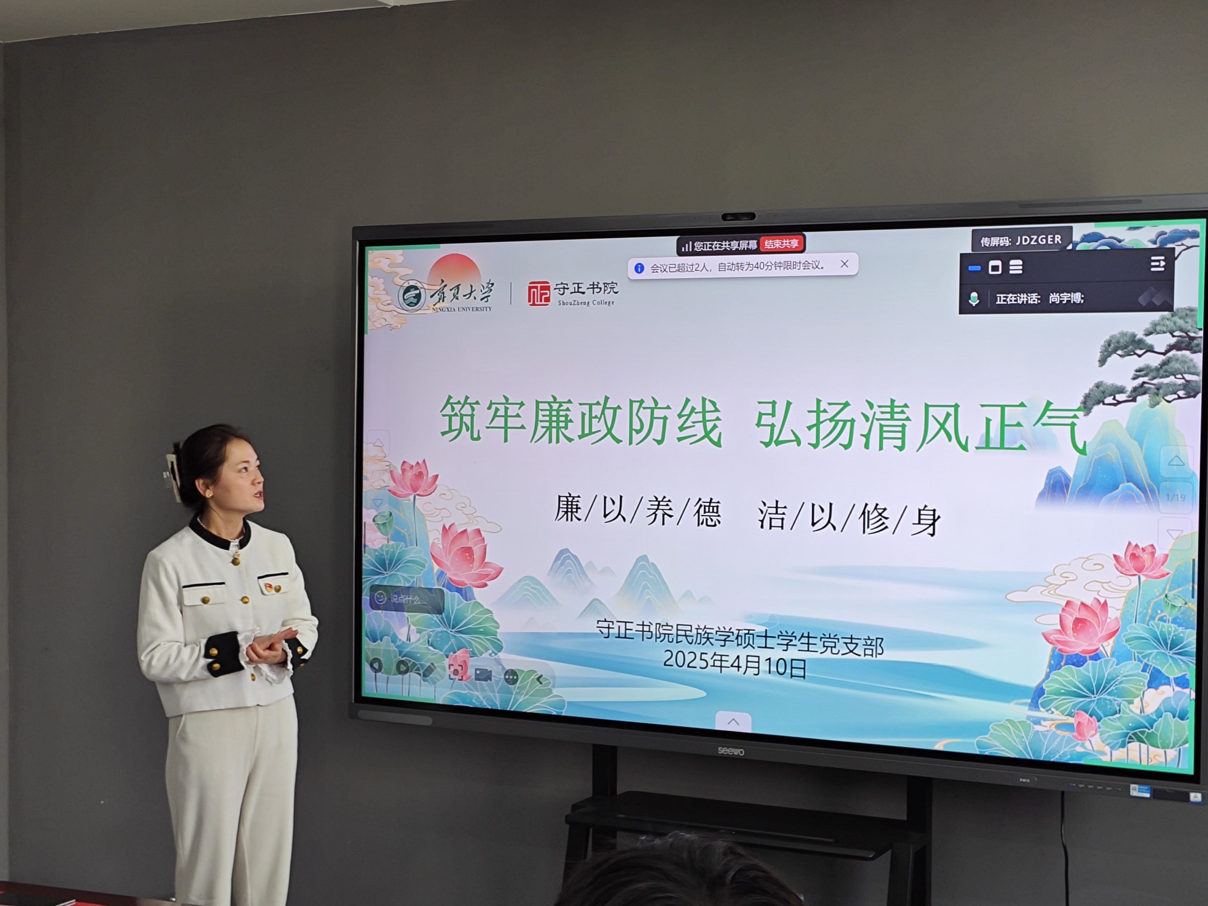 【永利集团304官网新闻中心讯 守正书院】为扎实开展“廉政警示教育月”活动,深入推进学校“五位一体”党建示范体系建设,落实基层党组织建设提质增效工程,4月10日,守正书院民族学硕士学生党支部以线上线下相结合的形式在怀远校区曾宪梓楼218会议室开展题为“清正廉洁守初心 田野思政担使命”的“廉政警示教育月”活动”暨“田野思政课堂”党小组汇报分享会。民族学硕士学生党支部全体党员参加,活动由党支部书记余晓玲主持。
