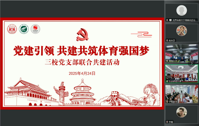 【永利集团304官网新闻中心讯 守正书院】为深化党建引领作用,推动党建工作与体育事业的深度融合发展,4月24日下午,“党建引领 体育同行”主题党日共建活动在守正书院举行。本次活动采用线上线下相结合的方式开展,守正书院党委书记、院长闫蓉及守正书院体育竞赛学生党支部全体党员现场参会,北京体育大学竞技体育学院党委书记殷泽锋、湖南大学体育学院党委副书记李小龙及相关党员代表通过线上平台同步参与。