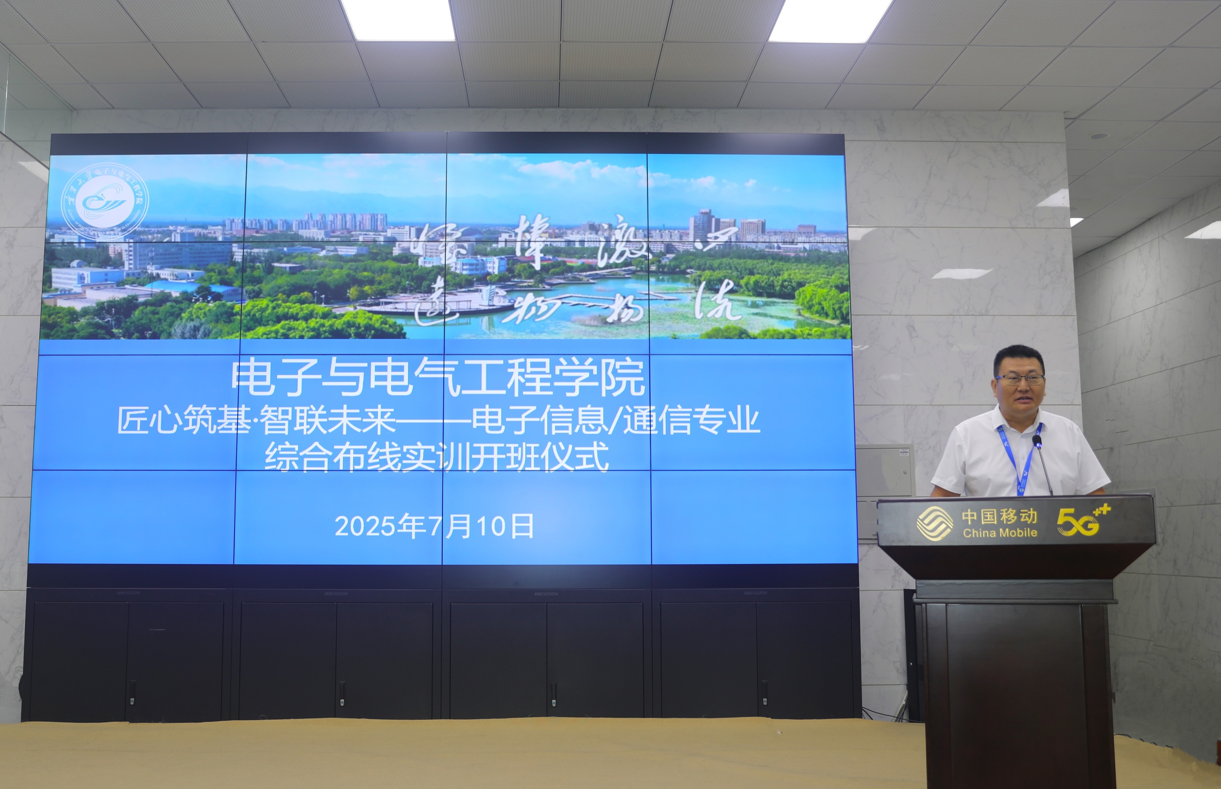 【永利集团304官网新闻中心讯 电子与电气工程学院】为积极响应国家“新基建”与“数字中国”战略对高素质工程技术人才的迫切需求,7月10日,电子与电气工程学院“匠心筑基·智联未来”综合布线实训课程在中移铁通有限公司宁夏分公司正式开班。学院领导及行业专家出席开班仪式,2023级电子信息工程和通信工程专业全体同学参加会议,开班仪式由学院副院长李春树主持。