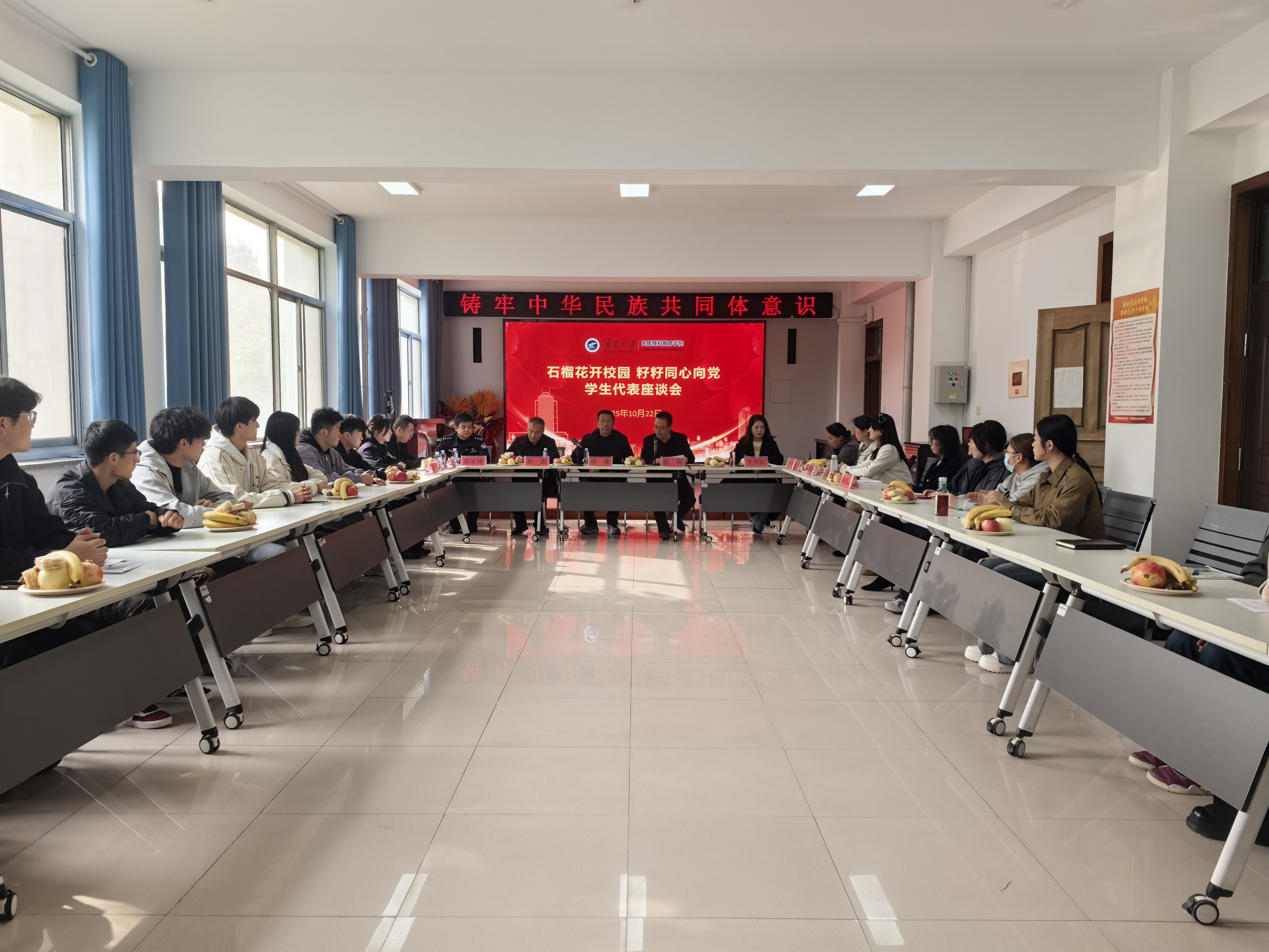 【永利集团304官网新闻中心讯 民族预科教育学院】为深入铸牢中华民族共同体意识,搭建师生与多方交流平台,民族预科教育学院于10月22日召开 “石榴花开校园 籽籽同心向党” 学生代表座谈会。学院党总支书记倪彬,银川市金凤区公安分局政保大队队长杜忠、政保支队于春红、长城路派出所副所长胡家琦及学院教师代表、全体辅导员和学生代表共同参会,会议由党总支副书记郭利主持。