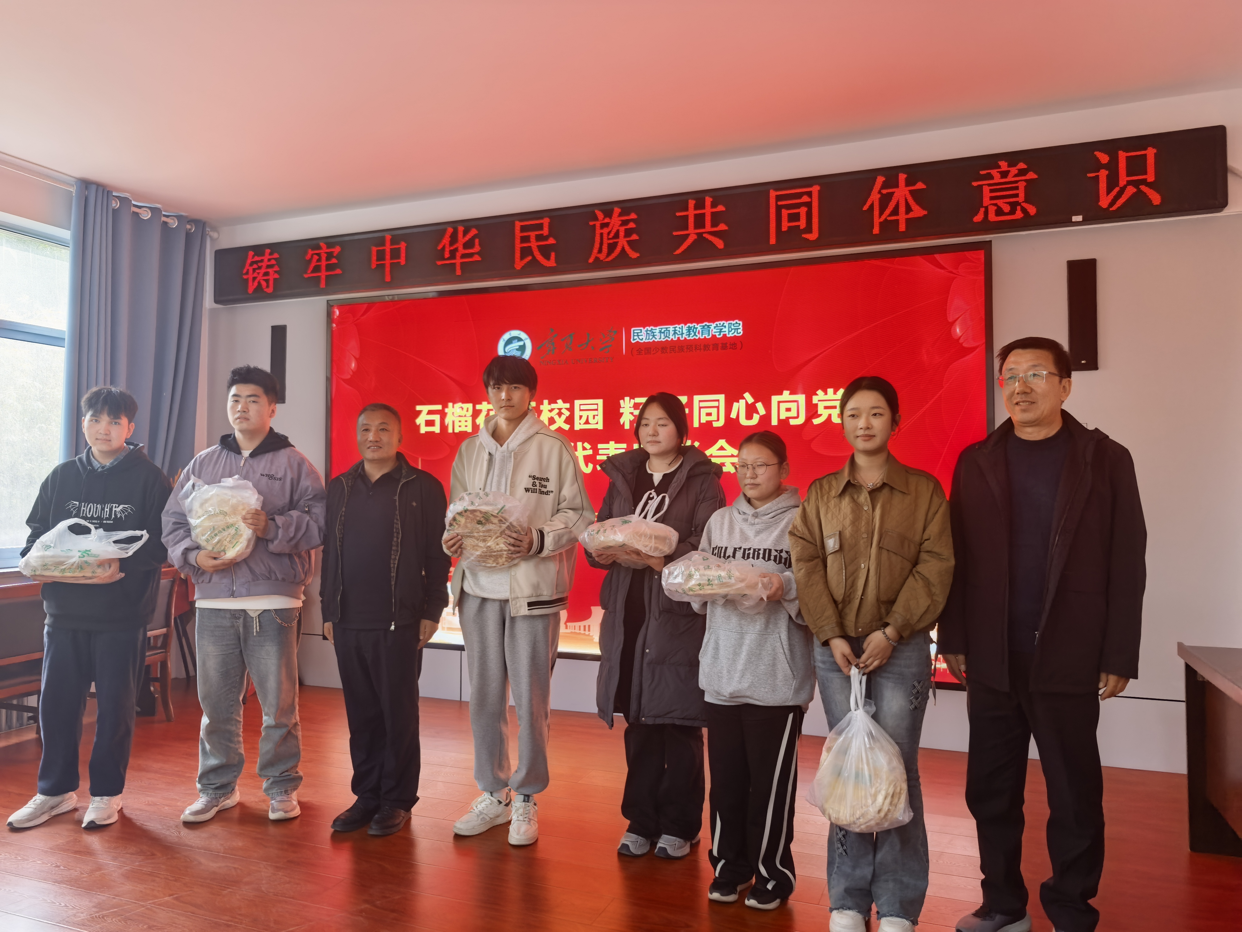 优秀班主任代表谢静雯老师从教育教学与学生培养角度出发,希望同学们尽快适应新的环境,迅速地投入到新的学习生活中去,结合教学案例,鼓励学生们以包容开放的心态拥抱多元文化,在互助学习中共同进步,为铸牢中华民族共同体意识贡献青春力量。银川市金凤区公安分局政保大队队长杜忠、长城路派出所副所长胡家琦先后发言。他们围绕校园安全、民族团结法治保障等内容,用通俗易懂的语言解读相关政策法规,分享了维护校园稳定、促进民族和谐的实践经验,并表示将持续为学院师生营造安全、和谐的校园环境,为民族团结工作提供坚实保障。同时还为学生送上500个馕,为座谈会赋予深厚内涵。