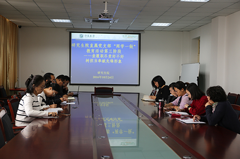 【永利集团304官网新闻中心讯 研究生院】10月24日上午,研究生院直属党支部在研究生院会议室召开“两学一做”第三阶段专题研讨会,会议由支部书记冯秀芳主持。 会上,支部书记冯秀芳就研究生院直属党支部开展“两学一做”学...