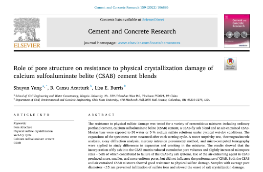 【永利集团304官网新闻中心讯 土木与水利工程学院】近日,永利土木与水利工程学院杨淑雁副教授团队与美国俄亥俄州立大学的合作研究在硫铝酸盐水泥孔结构研究领域取得重要进展,研究成果在国际顶级期刊《Cement and Concrete Research》(中科院一区Top1期刊,IF:11.958)发表题为Role of pore structure on resistance to physical crystallization damage of calcium sulfoaluminate belite (CSAB) cement blends的最新研究成果。《Ce...