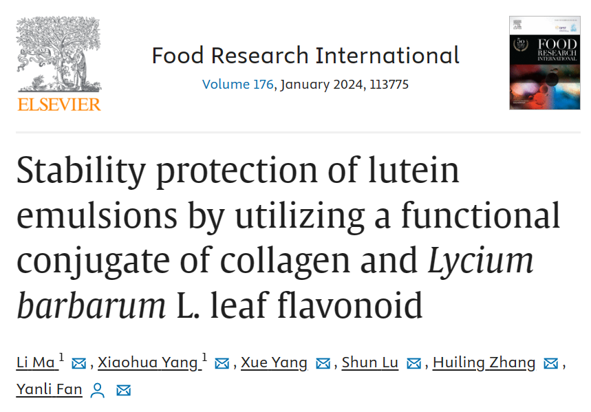 【永利集团304官网新闻中心讯 食品科学与工程学院】近日,食品科学与工程学院食品营养与健康创新团队范艳丽教授课题组在Food Research International(1区,IF8.1)发表题为“Stability protection of lutein emulsions by utilizing a functional conjugate of collagen andLycium barbarumL.leaf flavonoid”的研究性论文(胶原蛋白和枸杞叶黄酮的功能复合物对叶黄素乳液稳定性的保护作用)。叶黄素具有良好的生物学功能,但其物理和...