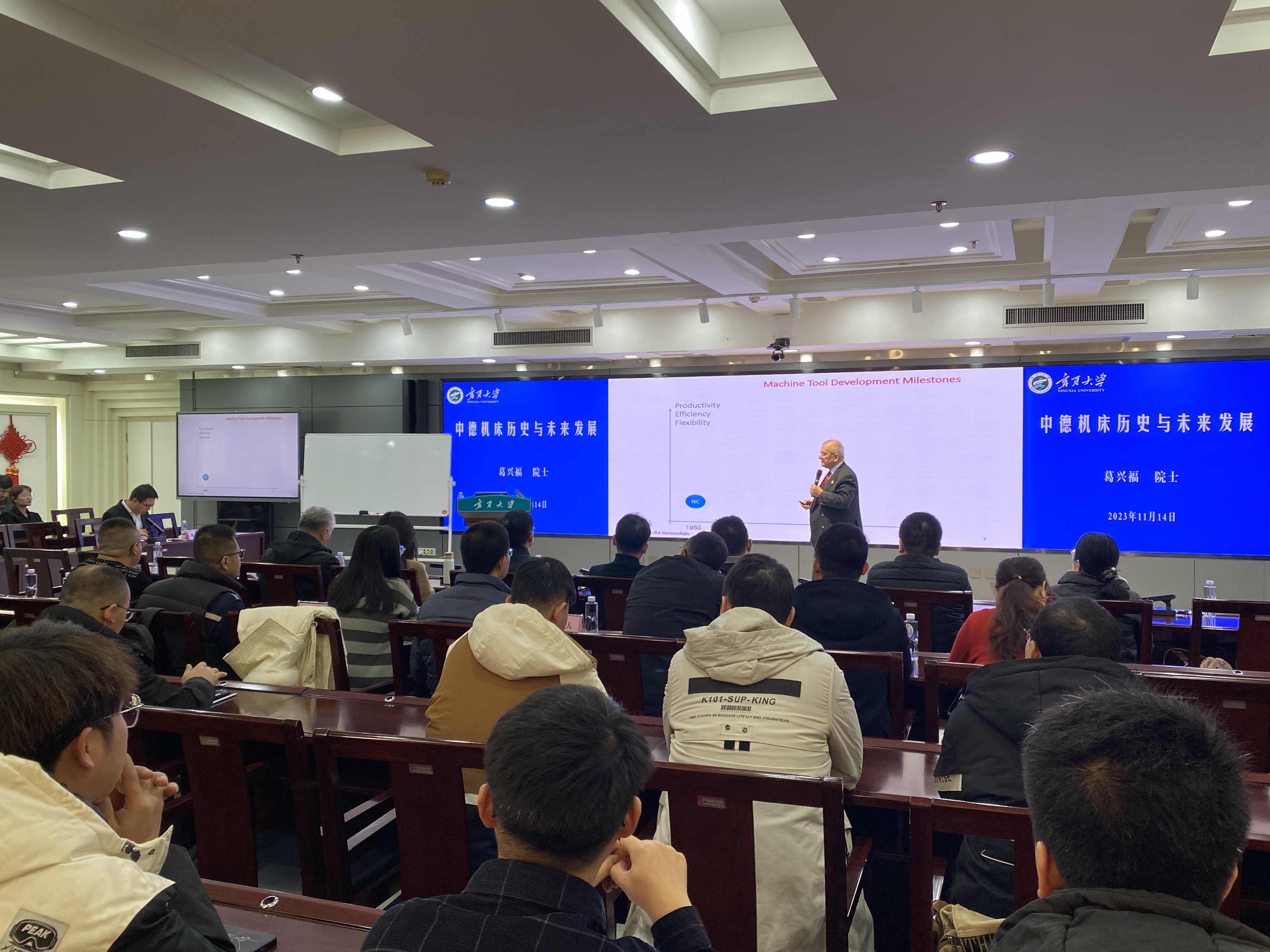 【永利集团304官网新闻中心讯 前沿科学与技术学部】为增强我区企业创新效能,发挥企业创新主体作用,11月14日-17日,自治区科技厅(外国专家局)邀请德国工程院院士、机床制造业知名专家葛兴福来宁,开展机械制造业科技创新合作对接活动。葛兴福院士在永利集团304官网举办了《中德机床历史与未来发展》报告会,会议由前沿科学与技术学部常务副部长、机械工程学院执行院长张波教授双语主持,葛院士从机床发展趋势、数控系统发展、基于大数据机...