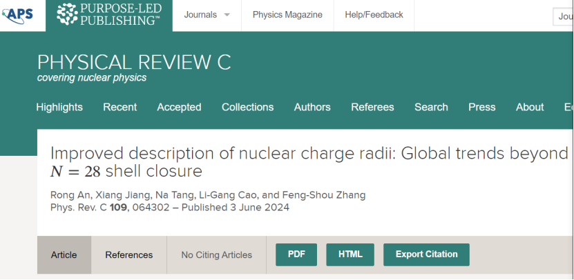 【永利集团304官网新闻中心讯 物理学院】近日,物理学院理论物理组青年教师安荣博士和唐娜博士与深圳大学蒋翔博士、北京师范大学曹李刚教授以及张丰收教授,在美国物理协会权威期刊《Physical Review C》上发表题为《Improved description of nuclear charge radii: Global trends beyond N=28 shell closure》的原创性论文。文章通过引入中子和质子之间的关联性,提出了描述原子核电荷半径变化趋势的较为可靠的方法。文中指出,通过同...
