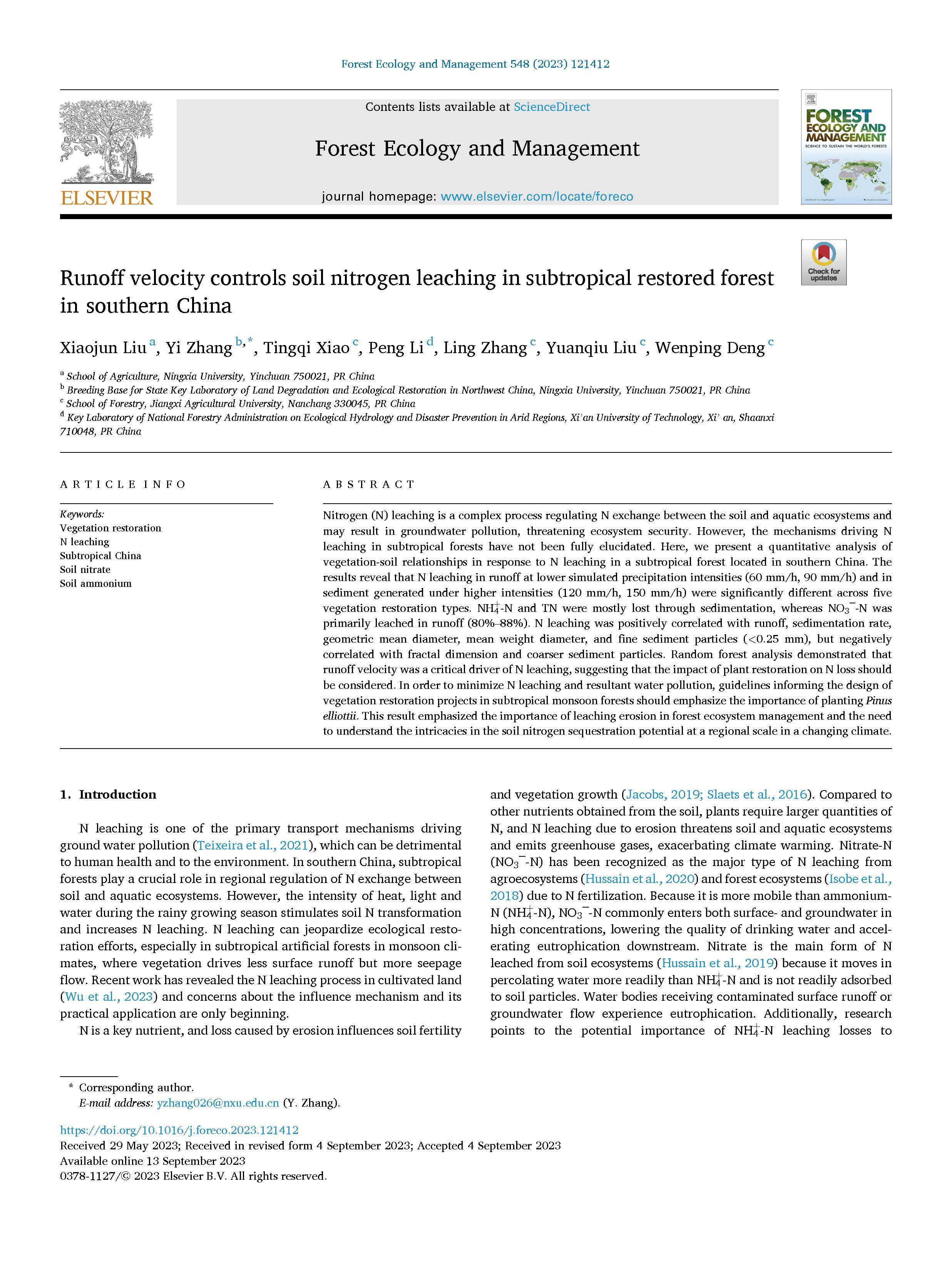 【永利集团304官网新闻中心讯 农学院】Essential Science Indicators(基本科学指标,简称ESI)数据库发布了最新的高影响力论文。土壤侵蚀及碳循环课题组一篇发表在《Forest Ecology and Management》(森林生态与管理,中科院1区TOP)上的论文成果“Runoff velocity controls soil nitrogen leaching in subtropical restored forest in southern China”同时被遴选为ESI数据库1‰热点论文和1%高被引论文。该论文第一作者为永利集团304官网农学院刘晓君副教授,生态环境学院张祎副教授为通讯作者,西安理工大学李鹏教授,江西农业大学张令教授、刘苑秋教授和邓文平副教授是论文的重要合作者。氮淋溶是调节土壤与水生态系统间氮交换的复杂过程,可能造成地下水污染,威胁生态系统安全。然而,亚热带恢复森林氮淋失的机制尚未完全阐明。该研究选取亚热带退化红壤区5种植被恢复模式,设计了4种淋溶强度,进行土柱淋溶实验,量化了植被恢复类型和淋溶侵蚀特征对氮淋溶的影响。...