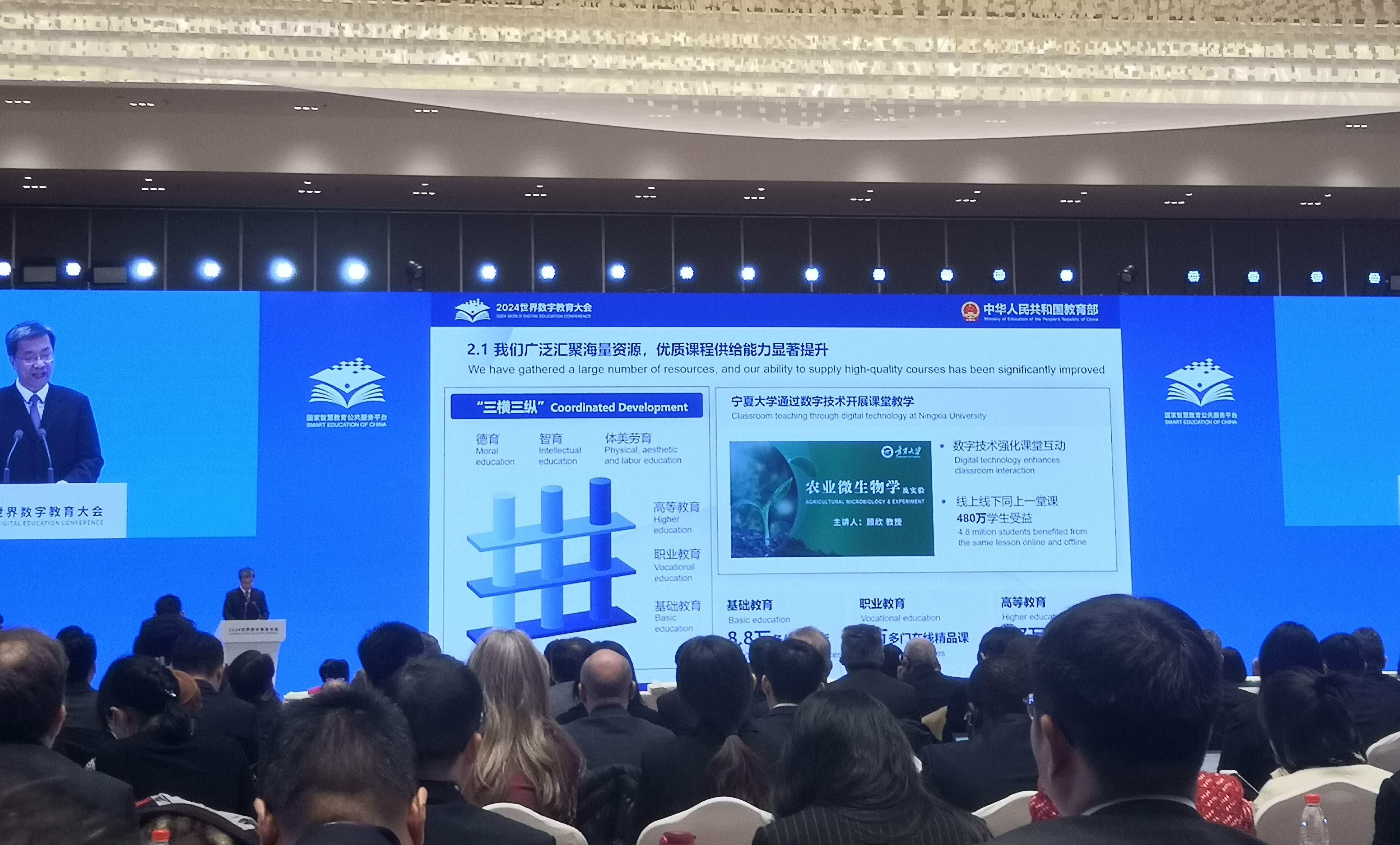 【永利集团304官网新闻中心讯 本科生院】1月29日至31日,由教育部、中国联合国教科文组织全国委员会、上海市人民政府共同举办的2024世界数字教育大会在上海召开。大会以“数字教育:应用、共享、创新”为主题,邀请包括瑞士等国领导人在内的全球70多个国家和地区以及有关国际组织的境外嘉宾、国内外代表等800多人,重点围绕教师数字素养与胜任力提升、教育数字化与学习型社会建设、全球数字教育发展趋势与指数评价、人工智能与数字伦理、数字变革对基础教育的挑战与机遇、教育治理数字化与数字教育治理等议题进行深入交流讨论。校党委副书记、校长彭志科代表学校现场参会。1月30日上午,教育部部长怀进鹏在大会上发表题为《携手推动数字教育应用、共享与创新》的主旨演讲。怀进鹏通过国家智慧教育公共服务平台应用典型案例——永利集团304官网顾欣教授主讲的《农业微生物学》课程,为来自世界各地的参会人员介绍了国家智慧教育公共服务平台在永利集团304官网的应用实践及数字化赋...