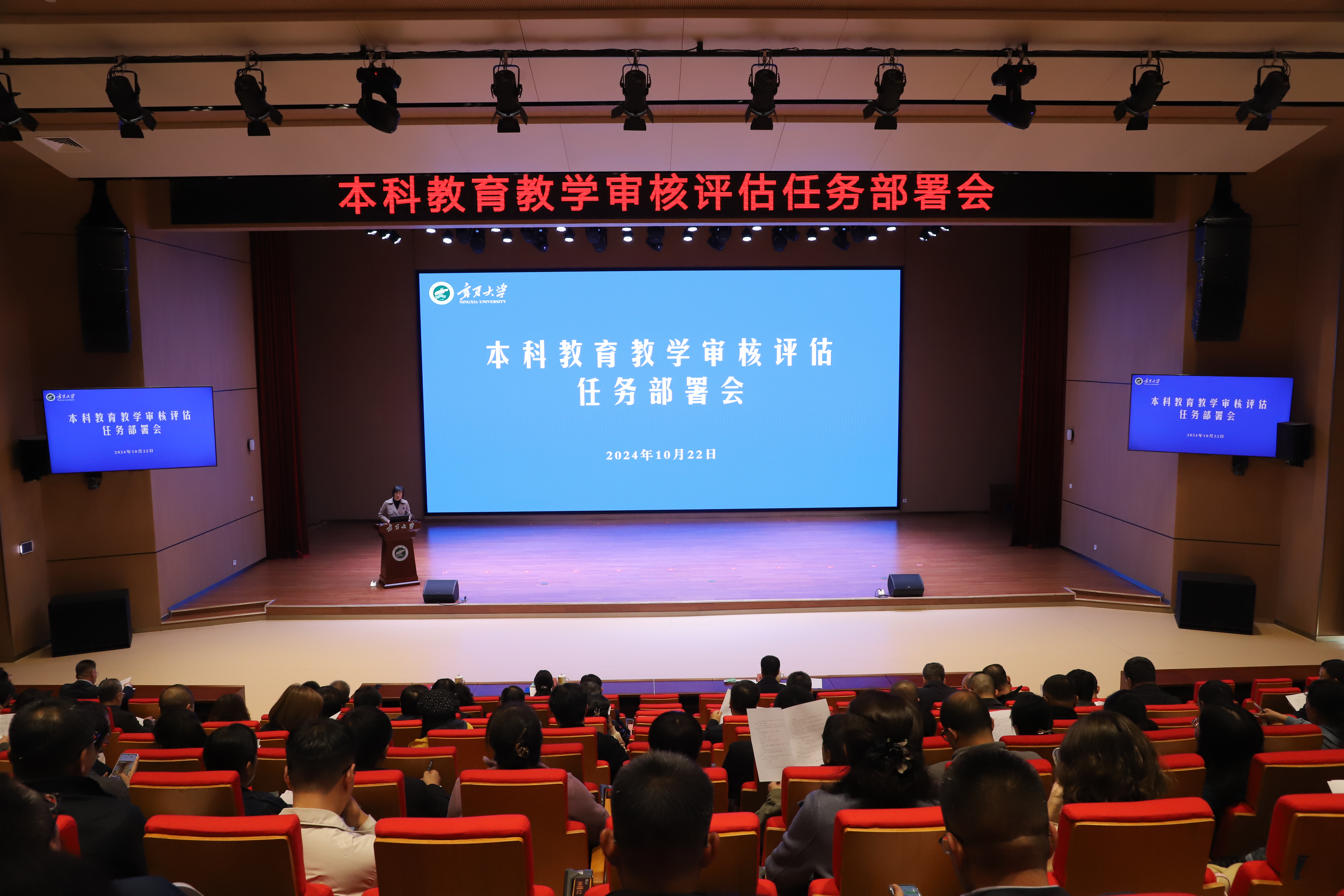 【永利集团304官网新闻中心讯 冯禹君/文 王文娣/图】10月22日,学校本科教育教学审核评估任务部署会在笃行楼一楼报告厅召开。校党委副书记韩惠丽,副校长赵晓佳,校党委常委、副校长谢海涛参加会议。韩惠丽主持会议。会上,杨晓宇副院长从预评估意见反馈、整改建议、整改要求等方面就本科教育教学审核评估预评估专家反馈意见作了汇报。张腾副院长围绕审核评估工作组、各单位重点工作、工作要求、评估流程及注意事项等方面对《本科教育教学审核评估线上评估工作方案》作了解读。谢海涛对学校线上评估重点工作作了安排部署。他指出,本科教育教学审核评估是事关学校发展的一件大事,是五年来全体教职工教育教学工作成效的集中体现。全校上下要提高政治站位,深刻认识审核评估对学校的重要意义,增强迎评工作的紧迫感和责任感,强化纪律意识,以谦虚诚恳的态度、昂扬向上的面貌、严谨务实的作风迎接专家“看、听、问、查”的全方位把脉,高质量、高标准完成本科教育教...
