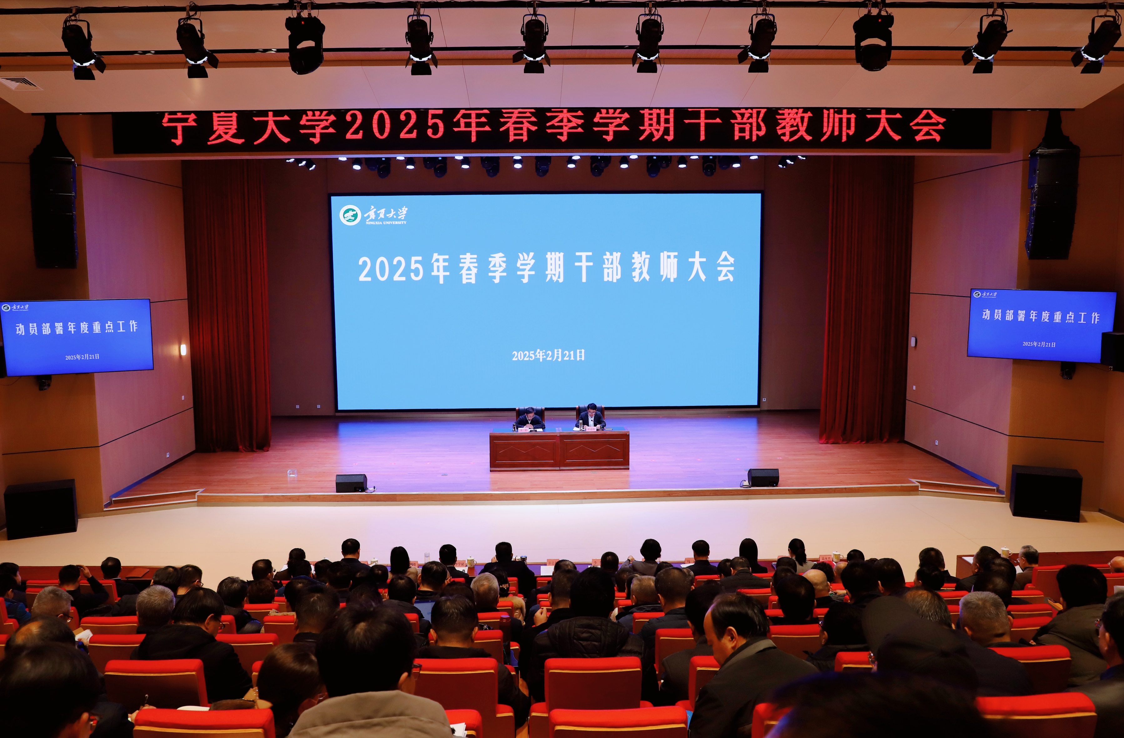 【永利集团304官网新闻中心讯 王文娣/文、图】2月21日下午,永利2025年春季学期干部教师大会在贺兰山校区笃行楼1楼报告厅召开。本次大会旨在统筹部署学校2025年度改革发展重点工作,分析研究学校综合改革难点问题,进一步凝聚全校干部教师力量,推动学校各项事业迈上新台阶。全体校领导参会,会议由校党委副书记、校长彭志科主持。彭志科对2025年度永利集团304官网重点工作任务进行了安排部署。他指出,2024年在学校党委的领导下,全校紧抓“双一流”建设和“部区合建”机遇,推进各项改革,取得显著成绩。2025年是建设高水平西部一流大学的开局之年、综合改革的攻坚之年,也是“双一流”建设目标任务的评估之年、深化自治区党委巡视反馈意见整改之年,也是实现“十四五”规划目标任务的收官之年和“十五五”规划的谋篇布局之年,他从深化综合改革、做好人才培养、推进“双一流”学科建设、做好2026年学位点申报准备、加大高层次人才引育力度、做好有组织的科研、做好“十...