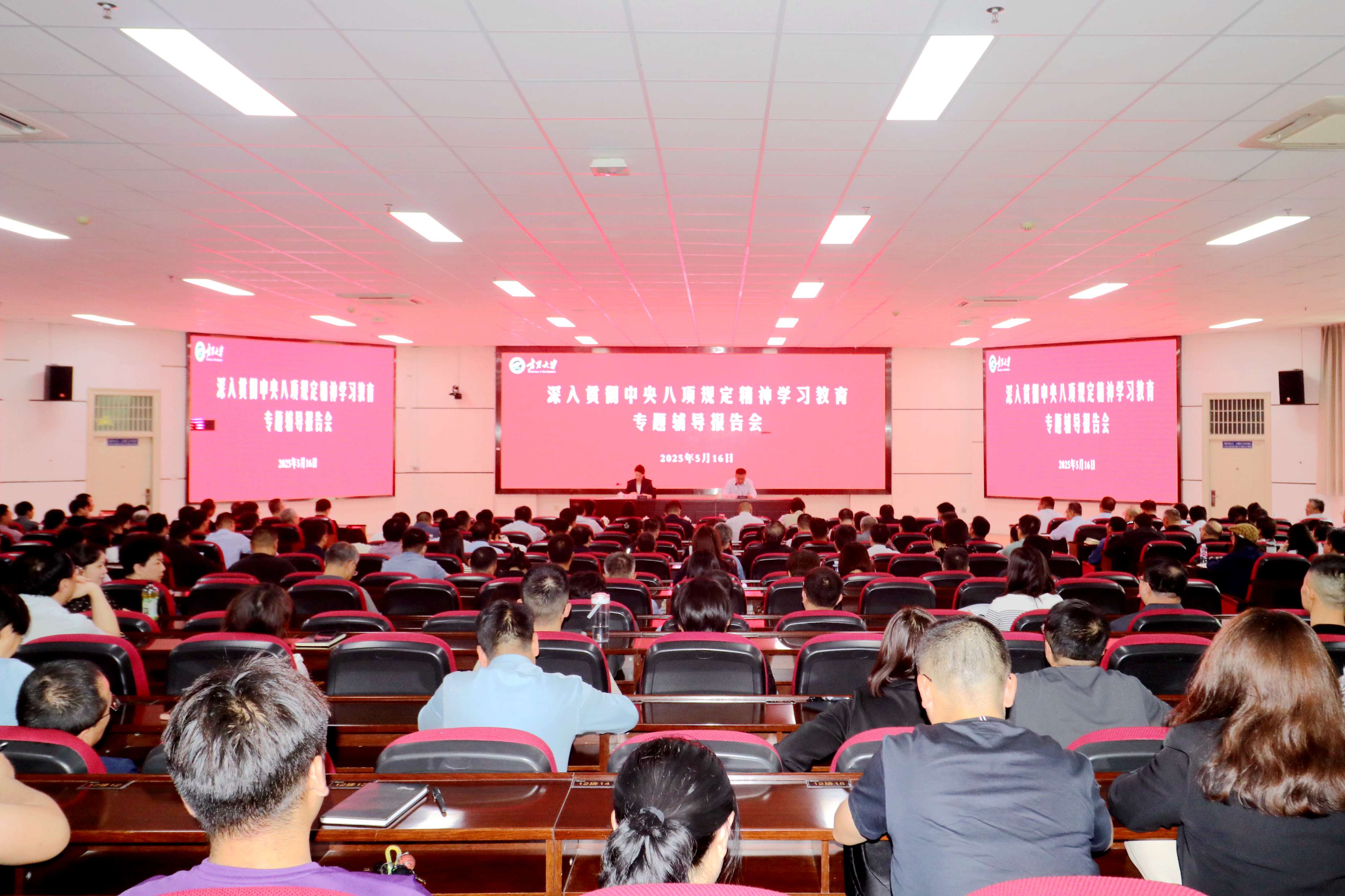 【永利集团304官网新闻中心讯 学生记者:宋丽群/文 张景/图】为扎实开展深入贯彻中央八项规定精神学习教育,引导党员干部准确把握中央八项规定精神的主旨要义和实践要求,5月16日,永利在贺兰山校区文荟楼报告厅举行深入贯彻中央八项规定精神学习教育专题辅导报告会,邀请自治区纪委监委第二监督检查室副主任马洁同志作专题辅导。全体在校校领导参加报告会,校党委副书记张桓主持会议。报告会深入学习习近平总书记关于加强党的作风建设的重要论述和中央八项规定精神的核心要义,结合典型案例深入浅出解读了违反中央八项规定精神的具体表现。报告指出,要扎实开展深入贯彻中央八项规定精神学习教育,以抓铁有痕、踏石留印的钉钉子精神,纠“四风”、改作风、树新风,持续加固中央八项规定堤坝,以优良作风为奋进新征程保驾护航。张桓在主持报告会时强调,深入贯彻中央八项规定精神学习教育是当前全党政治生活中的一件大事,各单位要在学习上再深化、不断夯实思想根基...