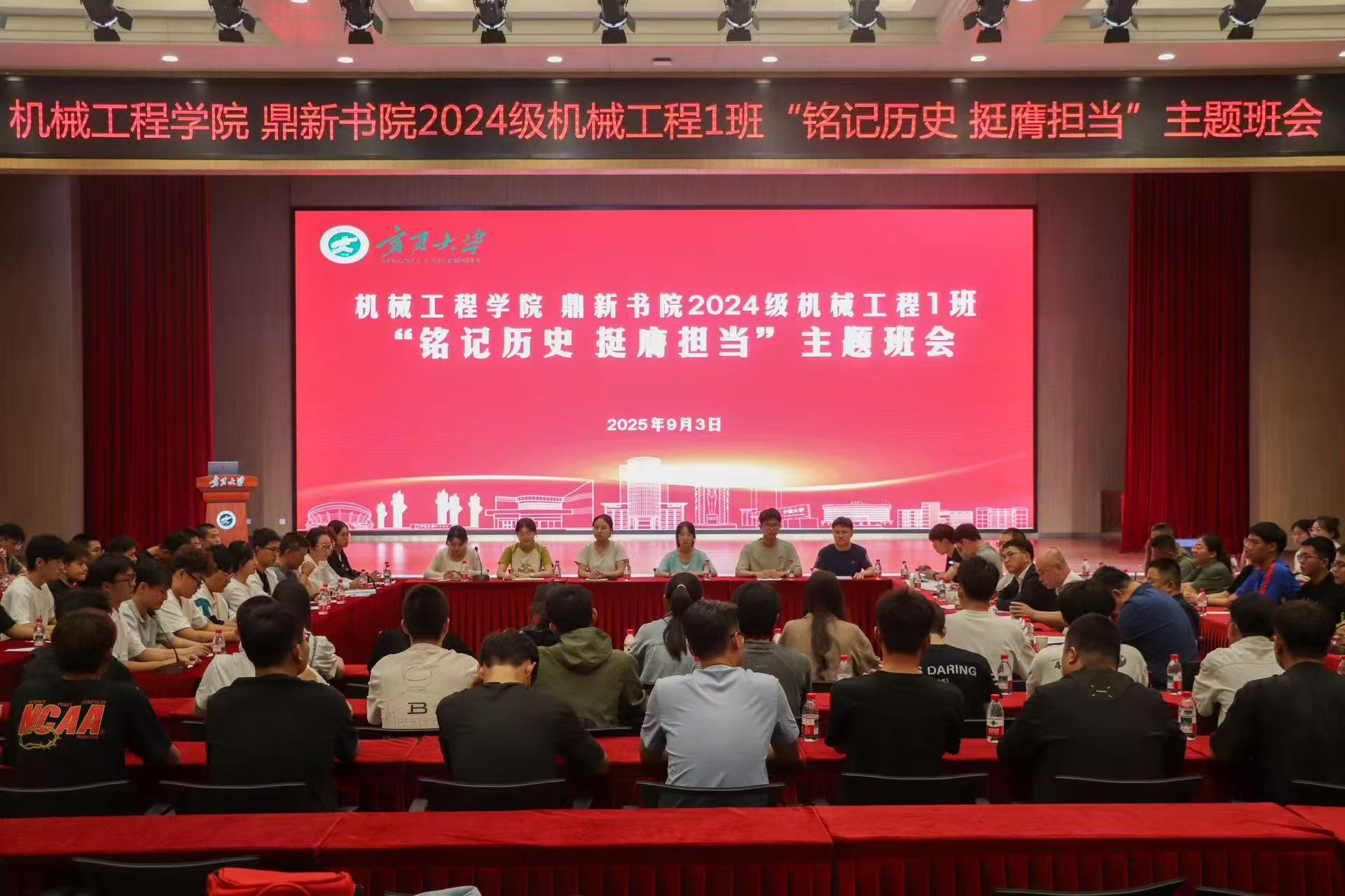 【永利集团304官网新闻中心讯 鼎新书院/文 学生记者:马文博/图】9月3日,纪念中国人民抗日战争暨世界反法西斯战争胜利80周年大会在北京天安门广场隆重举行。永利集团304官网组织师生以不同形式收看大会直播,聆听习近平总书记重要讲话,见证阅兵盛况。晚上7点,机械工程学院、鼎新书院2024级机械工程1班“铭记历史·挺膺担当”主题班会在笃行楼三楼报告厅举行。校党委副书记、校长彭志科走进班级与学子亲切交流。班会由辅导员王凤霞主持。班会伊始,“青春之歌”宣讲团献上《溯源觉醒·青春践行》经典诵读。激昂澎湃的诵读声引领同学们回望峥嵘岁月,深刻感悟先辈们为国为民的担当精神与热血情怀。2024级机械工程1班两任班长分别汇报了班级学生基本情况及荣誉获奖、参与社会实践等方面的成绩,全面展现了班级积极向上的集体风貌。6名学生代表分享了在校期间的学习体会与未来学业、职业发展规划。彭志科表示,自己一直惦念上学期开班会时与同学们的约定,也很欣喜看到同学们...