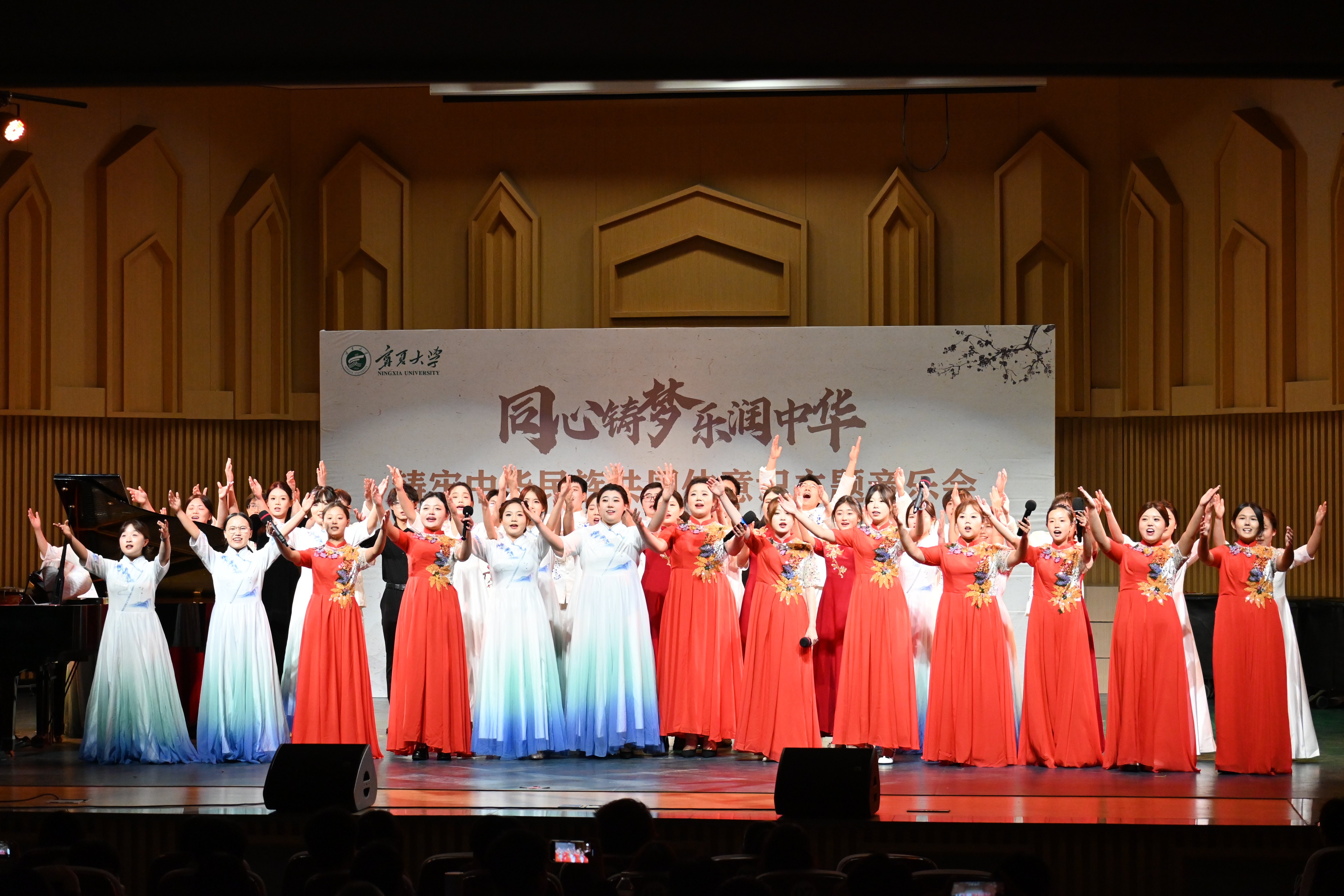 【永利集团304官网新闻中心讯 党委统战部、音乐舞蹈学院/文 学生记者李美璇、陈帅仰/图】为深入贯彻中央民族工作会议精神,扎实推进民族团结进步教育,9月29日晚,学校在德艺楼音乐厅举行“同心铸梦 乐润中华”铸牢中华民族共同体意识主题音乐会。校党委副书记韩惠丽,校党委常委、党委统战部部长朱学军与四百余名师生代表共同观看了这场融艺术性与思想性于一体的视听盛宴。音乐会在一曲洋溢着民族团结氛围的民族器乐合奏中拉开序幕。上半场以“华夏国风,丝竹和鸣”为主题,集中呈现了我国各民族丰富多彩的音乐文化。从西南地区的《太阳出来喜洋洋》到江南水乡的《茉莉花》,从湘西民歌《马桑树儿搭灯台》到山西民歌《走西口》,同学们以真挚的情感与精湛的表演,生动诠释了“五个共同”的深刻内涵。下半场“梨园精粹,塞上高歌”将现场气氛推向高潮。戏曲联唱《苏三起解》《刘海砍樵》展现了中华戏曲的独特韵味,而宁夏本土“花儿”《妹妹的山丹花开》《眼泪花花...
