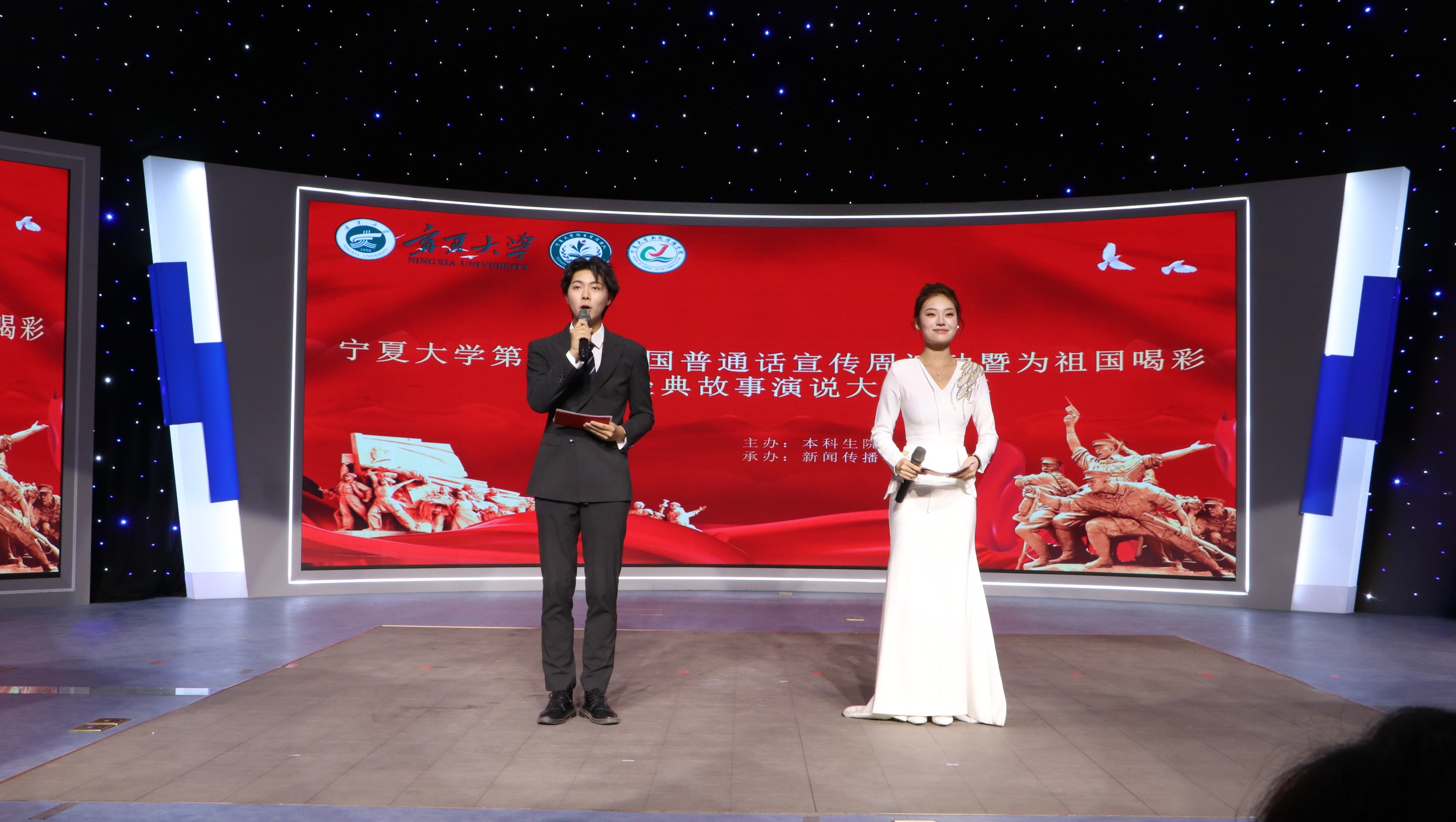 【永利集团304官网新闻中心讯 本科生院 新闻传播学院】为厚植家国情怀,传承红色基因,感悟经典传承,在中华人民共和国成立76周年之际,9月29日晚,永利集团304官网“为祖国喝彩——红色经典故事演说大赛”总决赛暨展演在贺兰山校区新闻传播学院演播厅精彩呈现。本次大赛自启动以来,吸引了全校各院系师生参加,比赛设置教师组、留学生组、大学生组(专业组和非专业组),经过层层选拔,最终10组选手脱颖而出晋级总决赛。决赛现场灯光璀璨,气氛庄重热烈。选手们以“演说+情景演绎”的创新形式,将红色故事与情感表达深度融合,构建起沉浸式的叙事空间。这不仅是一场语言的盛会,更是一场心灵的互动。通过演与说的形式,强化了文化浸润,传递了团结力量,让红色基因在新时代澎湃出新生力量。比赛以永利集团304官网附属小学西夏区第九小学肖忆心同学的序——《红》拉开序幕,《红旗渠》中娓娓道来的讲述展现了中华民族刚健自强的民族精神和锐意进取的时代精神;从《致先辈,这盛世...