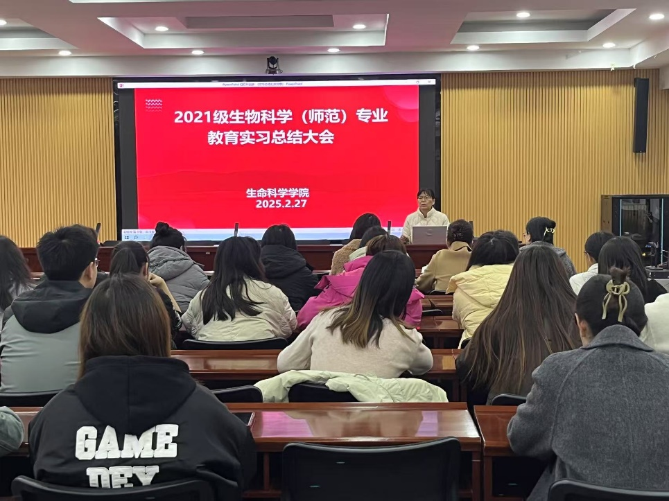 【永利集团304官网新闻中心讯 生命科学学院】2月27日,生命科学学院在文萃校区知本楼二楼报告厅举行了2021级生物科学(师范)专业教育实习总结大会。大会由师范教育教研室主任周续莲主持,全体实习指导教师及实习学生参会。会上,分布在银川市和石嘴山市21所中学的实习小组依次对实习工作进行了汇报。在为期一学期的实习过程中,实习生们全身心投入教育教学工作,认真听课、备课和上课,积极参与班级管理工作,虚心向指导教师请教,踊跃参加学校的各类活动。通过丰富的实践锻炼,不仅使他们的教学能力,交流沟通能力和综合素质得到了显著提升,还使他们对教师职业的内涵和教育工作的深远意义有了深刻的理解与体会。周续莲老师向同学们顺利完成实习任务表示祝贺,并高度评价了同学们在实习期间展现出的团结协作、虚心求教、自信创新的精神。她对实习小组的汇报及整体实习工作进行了全面总结。她指出,通过本次教育实习,同学们在课堂教学能力、教育技术运用能力、班...