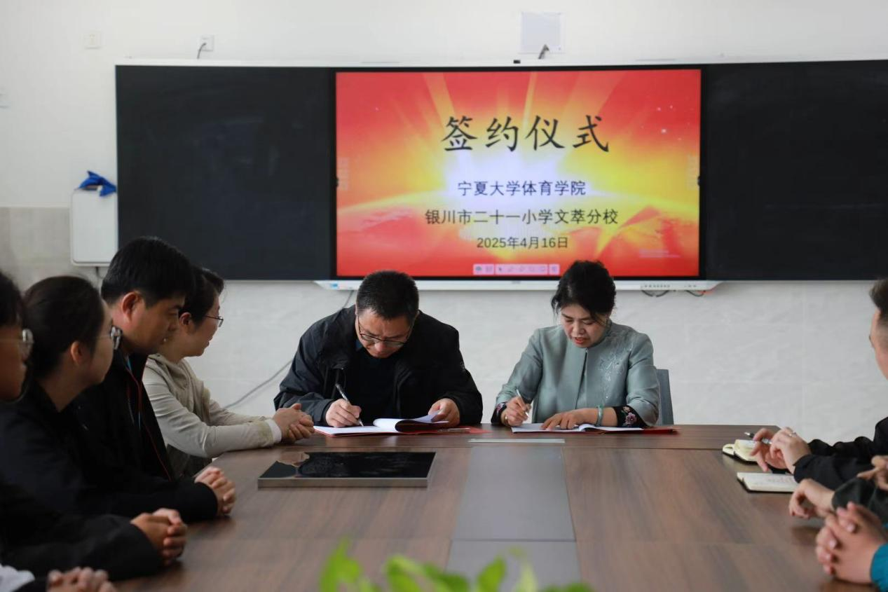【永利集团304官网新闻中心讯 体育学院】为进一步提高学生专业实践能力,促进高校与中小学协同育人发展,4月16日,永利体育学院与银川市二十一小学文萃分校正式签署实习实践基地合作协议。签约仪式在银川市二十一小学文萃校区举行,体育学院院长咸云龙、副院长古雅辉、运动训练系主任张志荣、银川市二十一小学文萃分校校长金佩兰等出席了此次签约仪式。签约仪式上,咸云龙表示,此次合作是双方在人才培养和教育教学改革方面的重要举措...